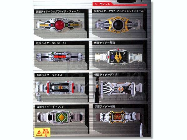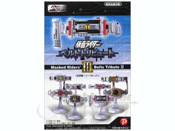 The celebration of our favorite masked heroes' belts continues with this third entry in the series, offering finely crafted mini replica belts for Kamen Rider Kuuga (Mighty Form), Kamen Rider Kuuga (Ultimate Form), Kamen Rider G3 (G3-X), Kamen Rider Ryuki, Kamen Rider Faiz, Kamen Rider Delta, Kamen Rider Garren, Kamen Rider Zanki, and one secret, for a total of nine possible types to trade and collect. A display base is included with each belt. Sold by the randomly packed box of 10. Produced by Plex and distributed by Happinet. Please note that these are trading items and are individually sealed and randomly packed in boxes of 10 by the manufacturer before shipment to HobbyLink Japan. As a result we are unable to honor requests for individual or specific items, nor can we promise you which one(s) you will receive in a box. Please order only if you are willing to accept any of the possible types.