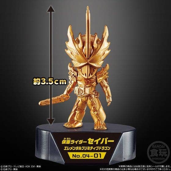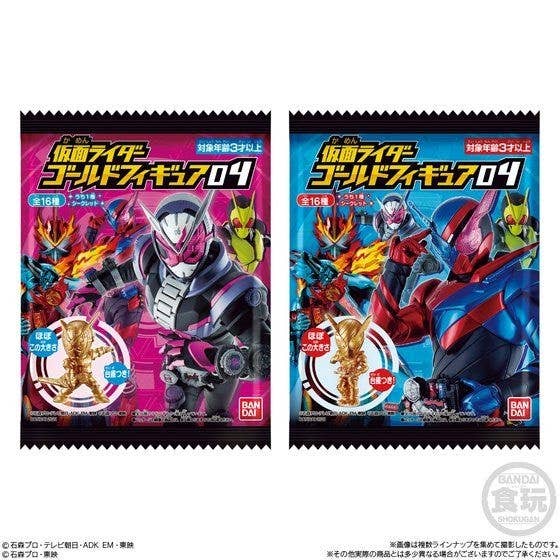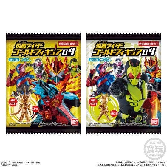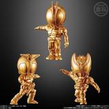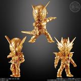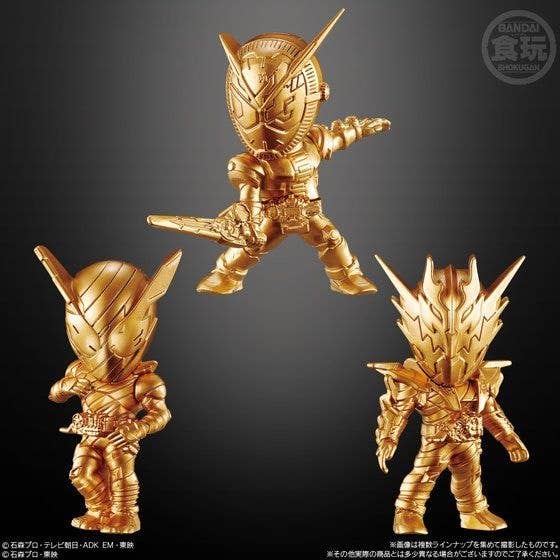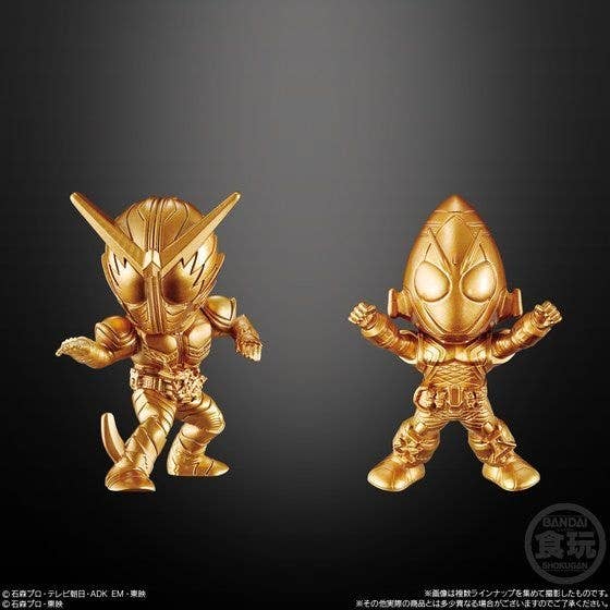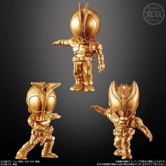 These amazing little "Kamen Rider" figures from Bandai feature an outstanding level of detail in each sculpt, a wide range of different characters from "Kamen Rider" series old and new, and a great price! Their slightly superdeformed style makes them a great addition to any collection; the gold color adds a sense of luxury to each figure, too. Each figure comes with a piece of ramune candy! There are 16 different figures available, and they're randomly packed in boxes of 16 -- order yours today!