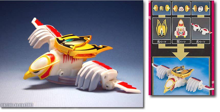 Like all entries in the Karakuri ("trick") Ball series, this item starts out as parts/weapons inside balls that can be mounted in the chest pod of DX Senpuuujin, DX Gouraijin and DX Tenkuujin. Try-Condor allows you to combine the DX Senpuujin, DX Gouraijin, and DX Tenkuujin robots (sold separately) into the titanic Tenrai-Senpuujin!