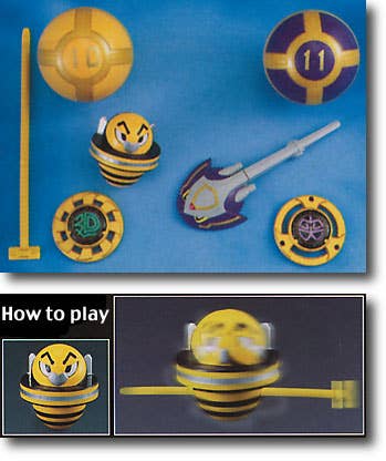 Like all entries in the Karakuri ("trick") Ball series, this item starts out as parts/weapons inside balls that can be mounted in the chest pod of DX Senpuuujin, DX Gouraijin and DX Tenkuujin. With this whirling Spin Bee and magnetic Kabuto Spear, you can power up your DX Senpuujin, DX Gouraijin, and DX Tenkuujin robots (sold separately) with new weapons. This set also includes Karakuri Balls 10 and 11, and Spin Bee and Kabuto Spear Shinobi Medals. Mostly ABS plastic.