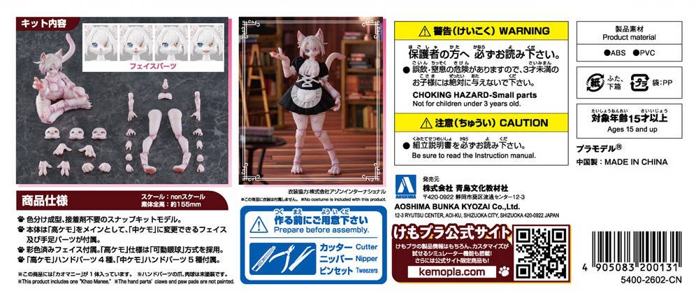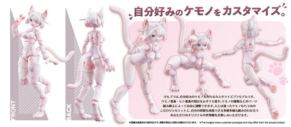 This model kit snaps together so glue isn't needed. The main body parts are "High Kemo," with face and limb parts included for "Medium Kemo" transformation. A total of four pre-painted faces are included; the "High Kemo" face features movable eyeballs. Four "High Kemo" hand parts and five "Medium Kemo" hand parts are included. The posable legs feature the "Kemo Fling System," which enhances action poses! Customize your figure further by combining it with separately-sold main kits and optional parts -- order yours today!