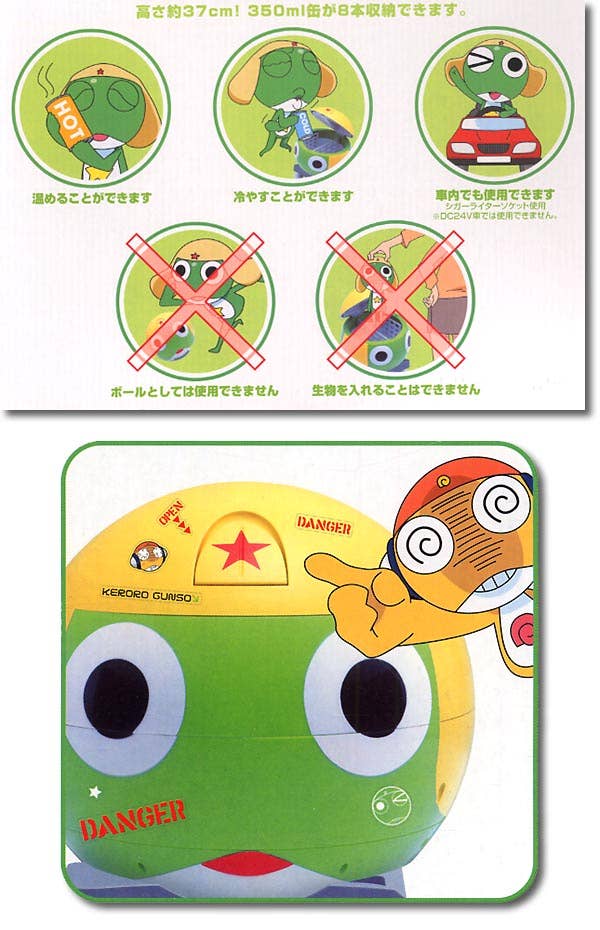 Too cute to pass up, this travelling cooler/warmer plugs into your car's cigarette lighter to cool -- or warm -- up to 8 355ml canned drinks! Runs on a 12V current (so you may need an adapter outside Japan). It comes with a little stand to keep it balanced while you're driving, too, as well as stickers to decorate it with, and a couple of coasters (convenient!). Measures 32cm wide and 37cm high, stand included. Warnings: do not play football with the Keroro cooler/warmer, and do not put live Keroros inside the Keroro cooler/warmer! (ha ha. Actually, don't put live anything, or anything other than canned drinks, into the cooler/warmer.)