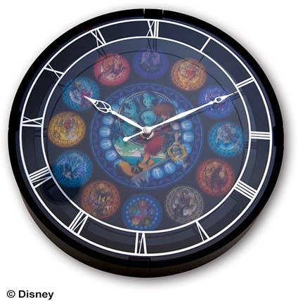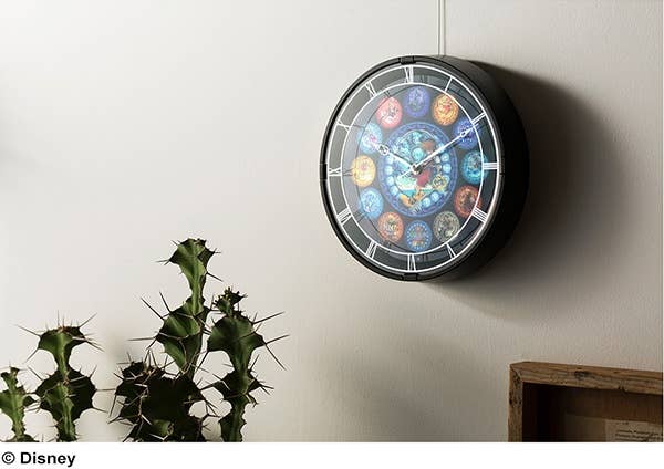 This is the clock you've been waiting for! It features colorful stained-glass-style illustrations based on "Kingdom Hearts;" when it's dark, the backlight will turn on automatically to give the artwork the vividly glowing look of real stained glass! The clock is about 28cm in diameter and 5cm deep. You need this in your life!