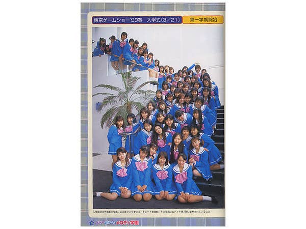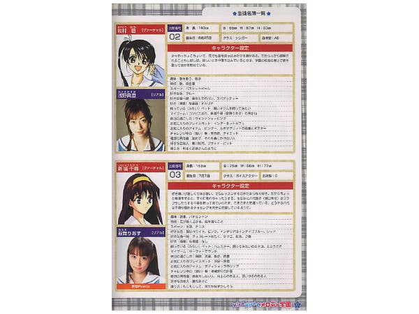 A warehouse find from 1999! This book covers the "Kira Kira Melody Gakuen" anime and game featuring lots of lovely young ladies who aspire to be idol singers, seiyuu and actresses. Features mostly photos from various live events, and information about the (real and virtual) students and tbe virtual school. A list of goods is also presented. All color. Softcover with dust jacket. Text is in Japanese.