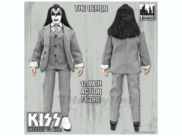 The tongue-thrusting vampire bassist known as "The Demon" is highly detailed and features 16 points of articulation. The Demon's face paint and outfit were derived from KISS's album entitled "Dressed to Kill" that was released on March 19th, 1975. His highly detailed legendary style comes complete with a gray scale pinstripe suit, matching the albums cover.