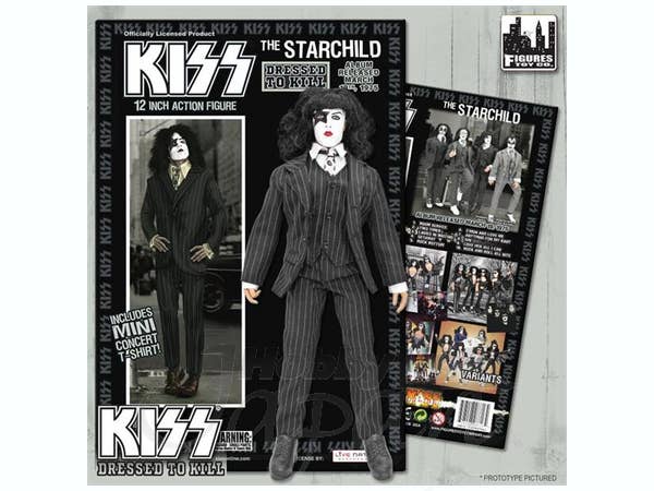 The glittering guitarist and lead vocalist known as "The Starchild" is highly detailed and features 16 points of articulation. The Starchild's face paint and outfit were derived from KISS's album entitled "Dressed to Kill" that was released on March 19th, 1975. His star-studded style comes complete with a black and white pinstripe suit!