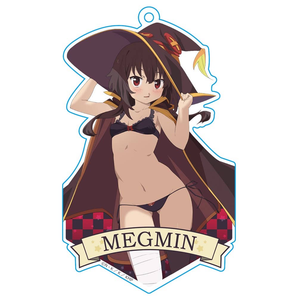 Fans of "KonoSuba" will want to get their hands on this brand new acrylic keychain featuring full color artwork of the character Megumin. Megumin is wearing a barely there black bikini underneath her cloak and hat. Add this keychain to your collection today, order now!
