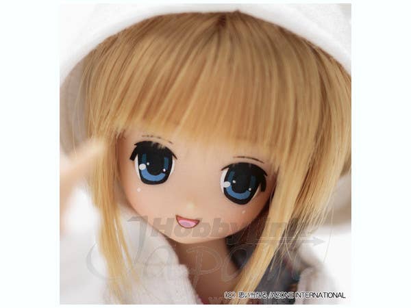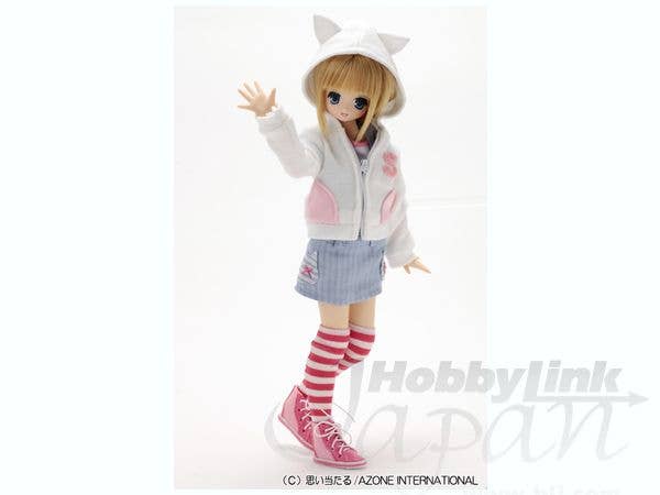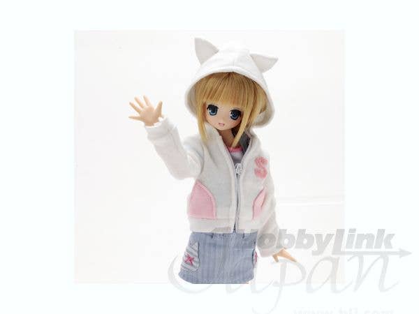 Isn't Koron adorable? With her big blue eyes and wide open-mouthed smile, she'll make your heart skip a beat! She's wearing a cute casual outfit from her favorite clothing line--Snotty Cat! She comes with a jumper skirt with cute pink buttons on the shoulder straps shaped like the Snotty Cat logo and a patch on the left hip; a T-shirt, and a white hooded jacket with cat ears on the hood. She also has a cute pink button-down shirt with a striped collar and patch pocket, and a matching pink tie, a cap, striped over-the-knee socks and pink sneakers. She's built on a Pure Neemo Flection body for all kinds of fun and adventure. It'll be a great day when she arrives at your house, so order her today and get ready to smile! Please note that the photos shown are of a prototype; the production version may vary.