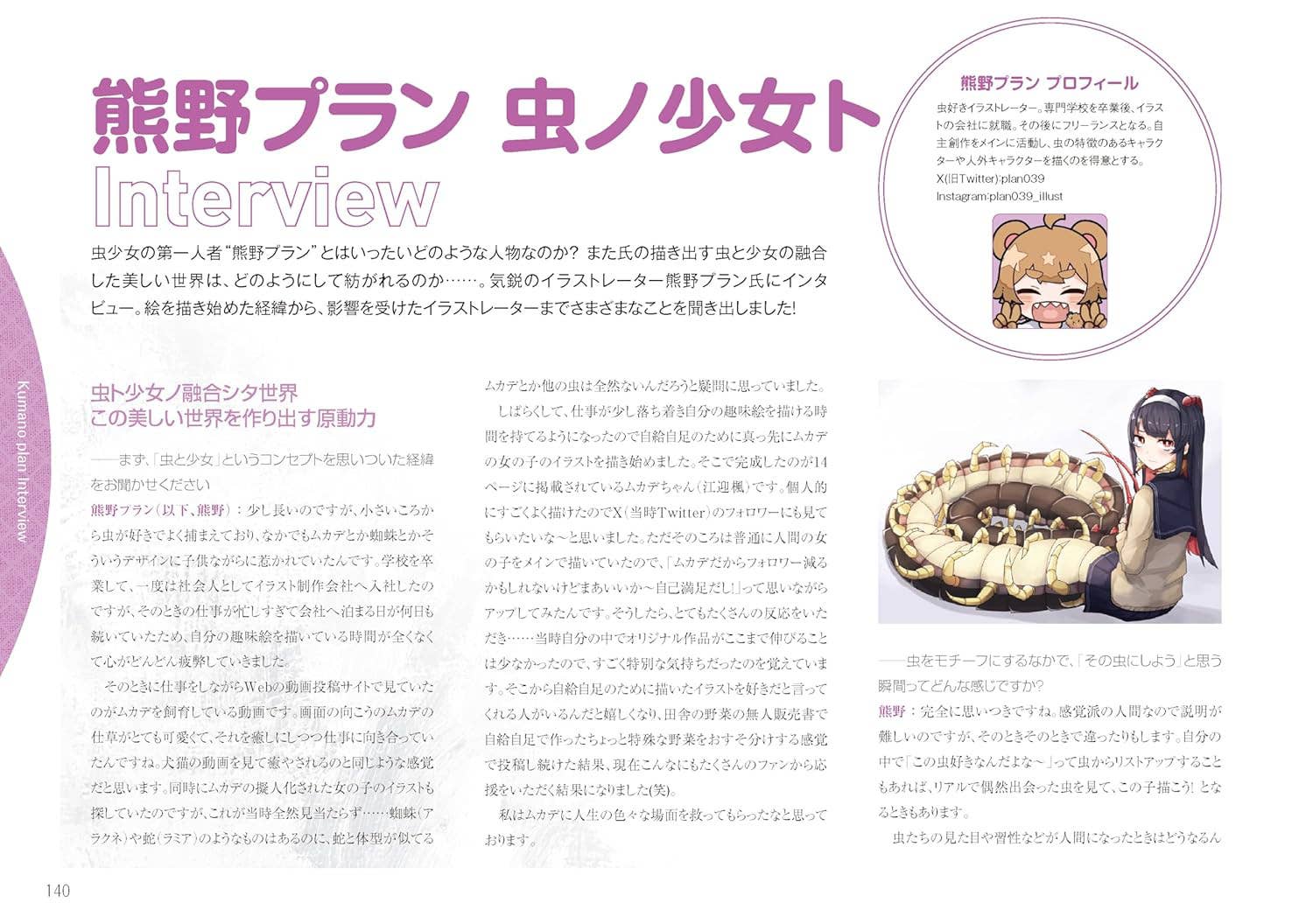 Active under the circle name "Sleeplan," Kumano Plan gained attention with the silkworm girl "Amanaka Tenko," nicknamed "Kaiko-chan," featured in the doujinshi Mushi no Shoujo to. The character's plush crowdfunding exceeded expectations, generating widespread buzz. This is Kumano Plan's first commercial illustration collection.