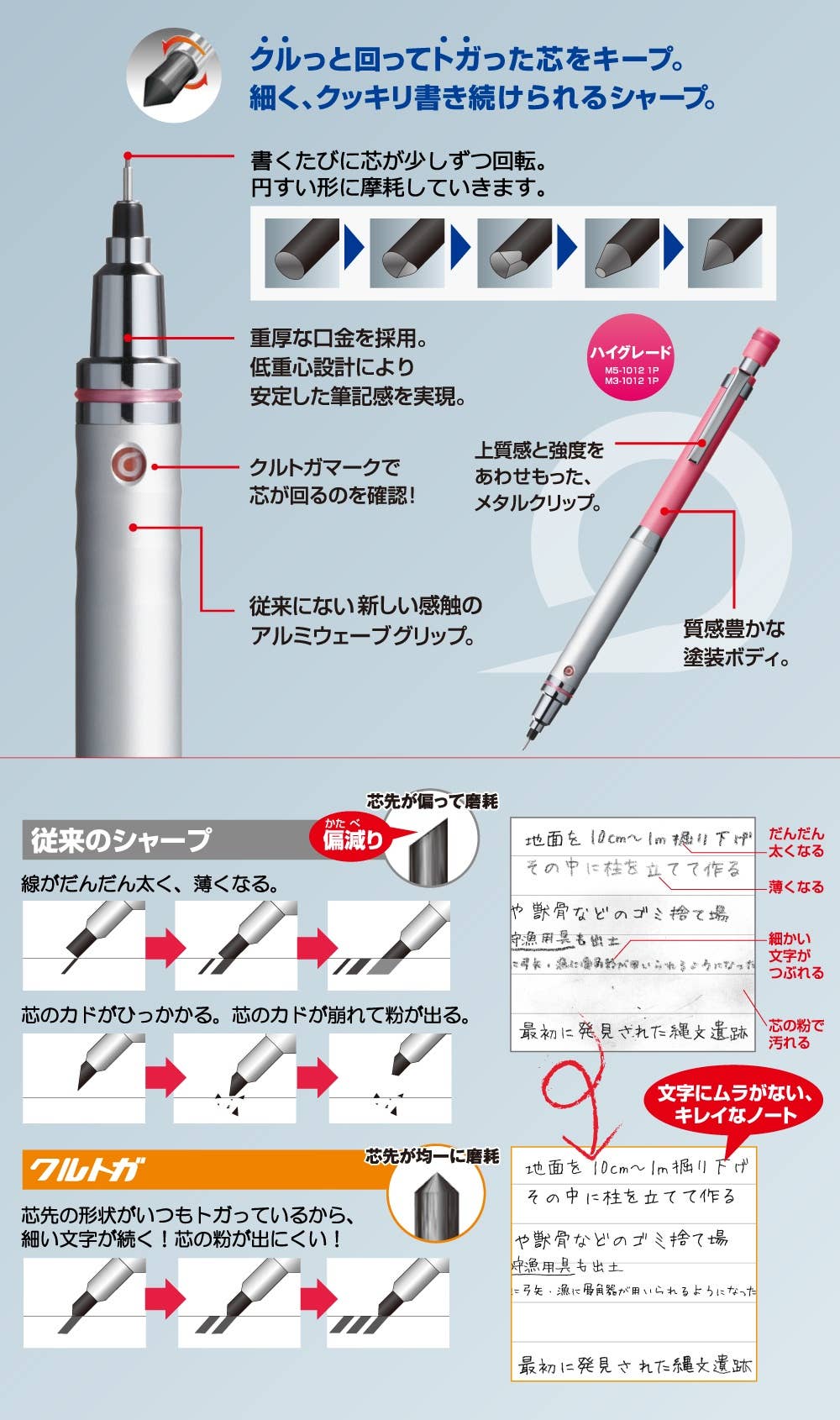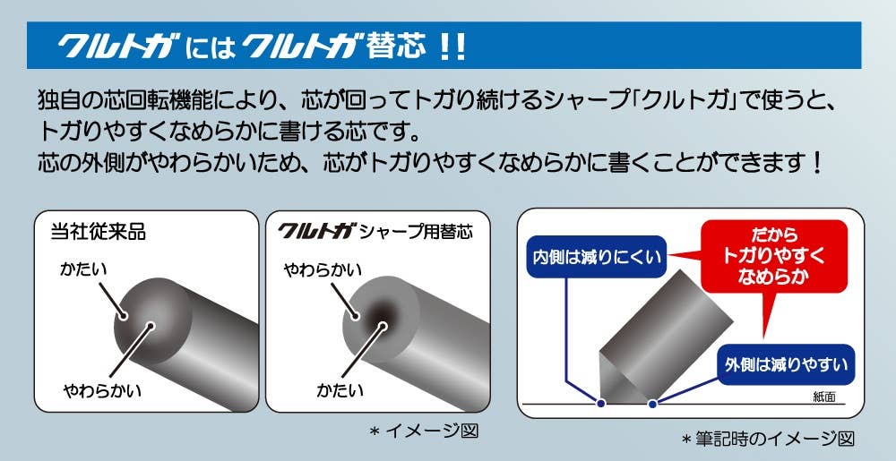 If you've ever been frustrated to find your writing with a mechanical pencil looks uneven, the Kuru Toga is the pencil for you! As many mechanical pencil users have noticed, the lead typically wears down on only one side, forcing you to write using the large flat, blunt edge of the lead, or the super pointy tip. Mitsubishi's fantastic answer to this problem is the Kuru Toga - a mechanical pencil which automatically rotates the lead as you write, so it never wears down unevenly! Every time you press down and lift up the lead of the pencil whilst writing, the lead is automatically rotated. You won't even notice it happening, but your writing will be all the more beautiful for it!