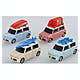 A set of four fully finished die-cast Tomica car models, featuring the Suzuki Lapin. The four "going out" versions feature a "roof box" version, a "snow board" version, a "surf board" version, and a "travel box" version, as shown here.