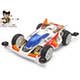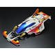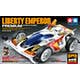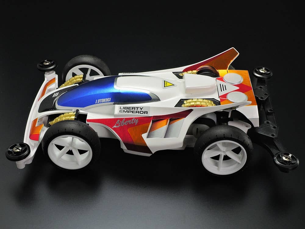 This kit creates a premium version of the Liberty Emperor piloted by Jingi Otoki, protagonist in the Mini 4WD cartoon The Wind Racer! Otokogi. The highly cool, aerodynamically advanced body features depictions of headlights, and slits in the racer-style side pontoons. Metallic stickers are included to decorate the white body with various logos and colored markings, plus the shimmering blue canopy section.
