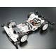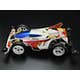The Super-II chassis offers impressive toughness on an adaptable frame. Here, it appears in white and is paired with black A parts. Easy locking gear cover is also molded in white. White narrow, lightweight wheels are paired with black arched tires. The model comes with 4.2:1 gears and motor.