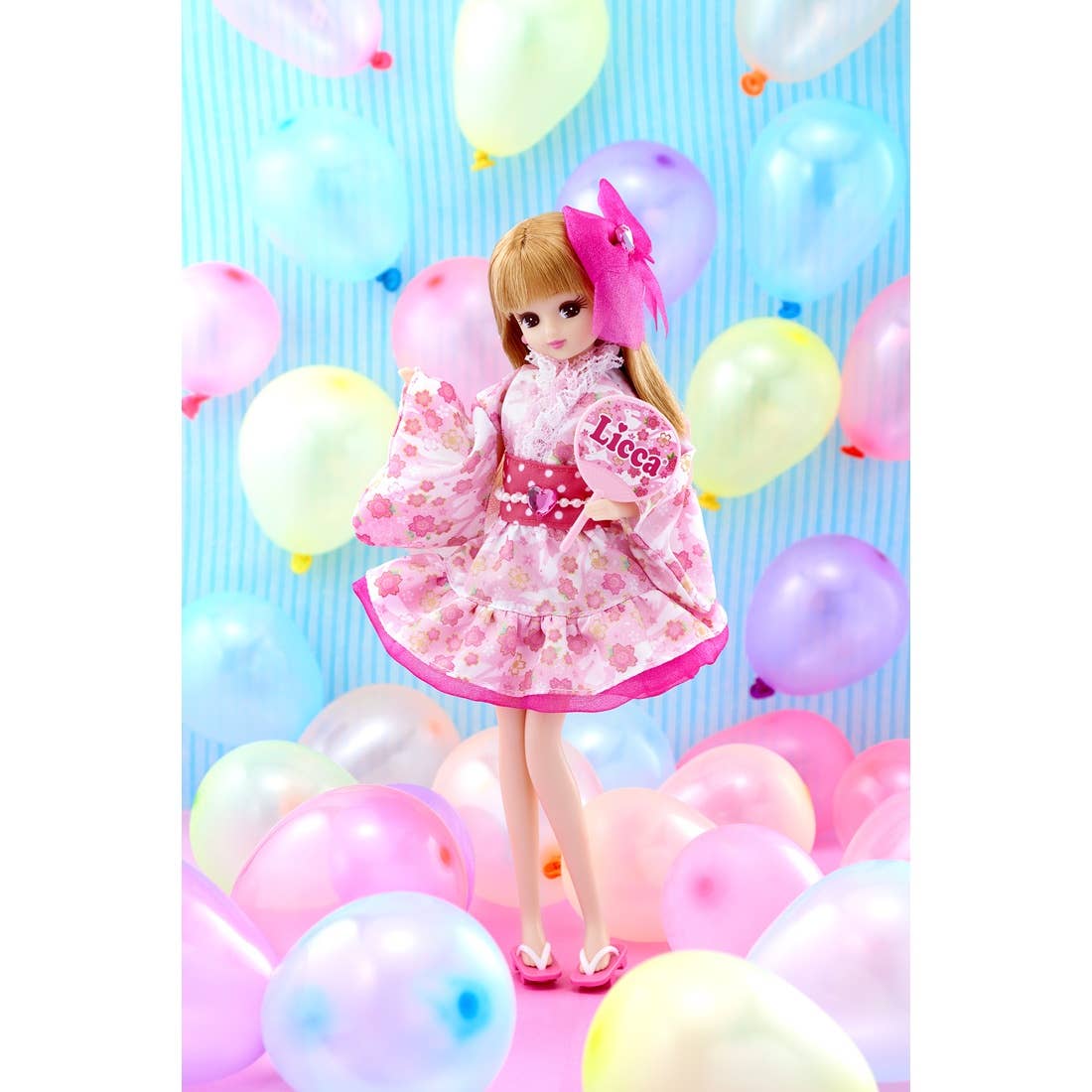 This sweet yukata-style dress for Licca is made with sakura-blossom-bedecked fabric and features a big bow in back, as well as a bow for her hair, a fan, and sandals to match! Made to fit Licca dolls by Takara Tomy and may not fit dolls by other manufacturers.