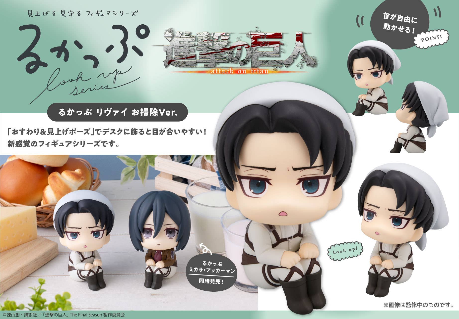 This series of figures from MegaHouse is called "Look Up" because they've been specifically designed to be looking up at you, making it easier to make eye contact with them when you display them at your desk -- and now Levi from "Attack on Titan," dressed for a cleaning session, is joining the lineup! With its large volume, slightly super-deformed design, and movable head, this figure will make you smile every time you look at it! Place your order now!