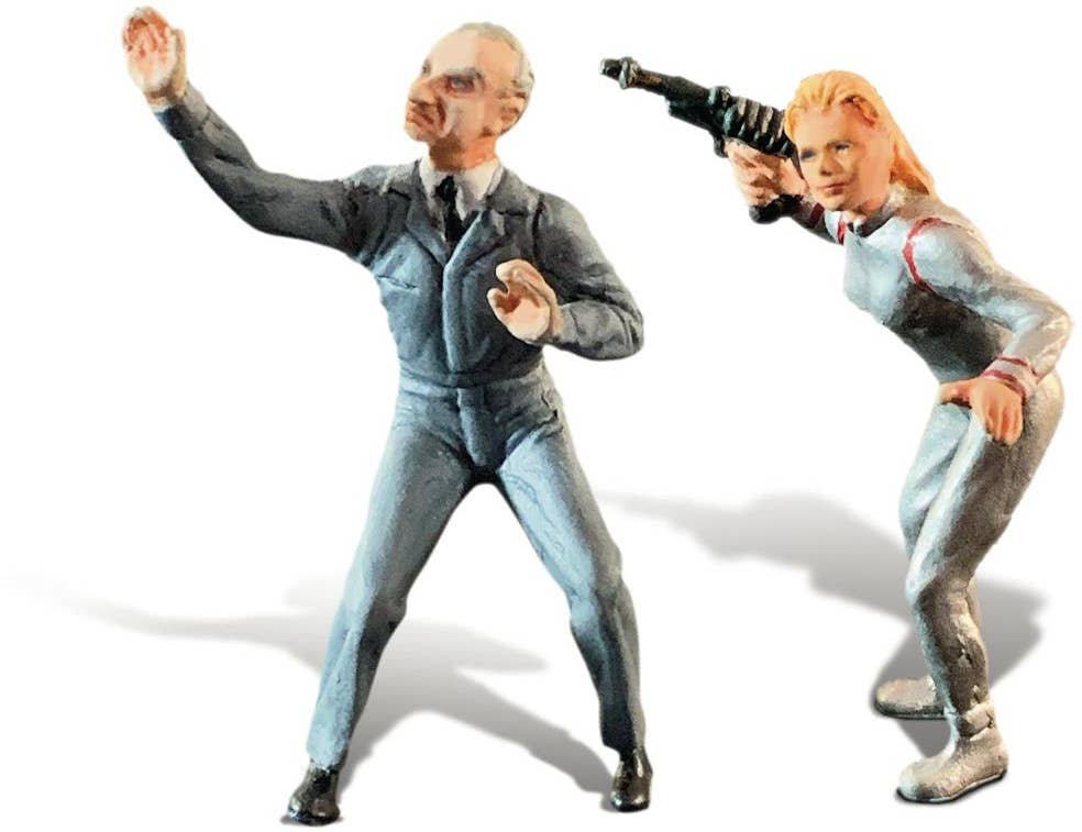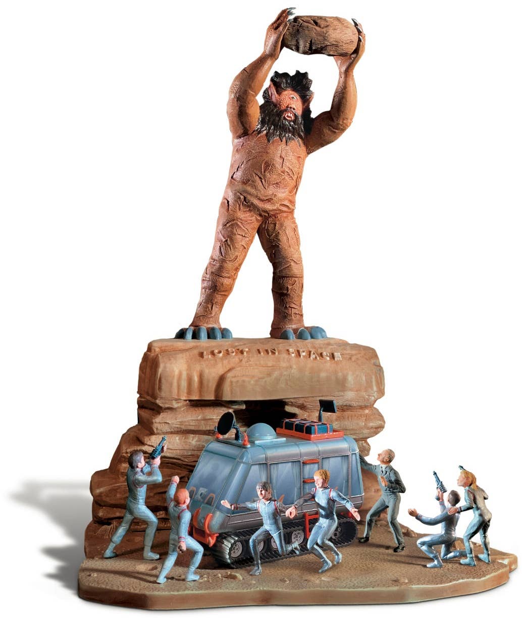 This amazing diorama model kit from the iconic 1965-68 TV show "Lost in Space" was originally released in 1966 by Aurora! In this tense scene, the Robinson family have encountered a massive cyclops creature, who threatens to smash them and their Chariot transport with a huge boulder. The included figures are dynamically posed as they flee or fight back against the beast! The Chariot is 1/48 scale, while the included figures are 1/35 scale. This new release comes with two extra figures -- Dr. Smith and Judy Robinson -- and also includes a full-color, double-sided backdrop sheet depicting an unknown planet, both by night and daytime! Updated decals are also provided. You won't want to miss out on this classic kit -- order yours today!
