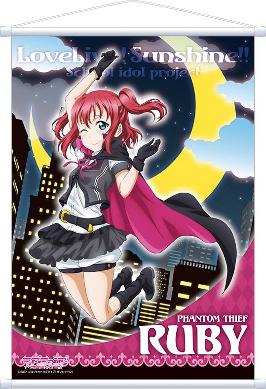 "Love Live! Sunshine!!" brings to you a new wall tapestry for you to enjoy! This wall tapestry features full color artwork of the character Ruby Kurosawa wearing her phantom thief costume over a background of a city and large crescent moon. An excellent addition to any fan's collection, order today!