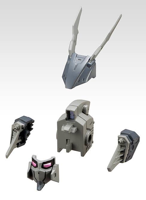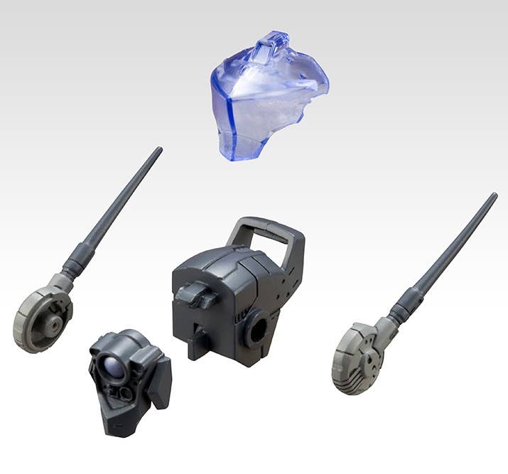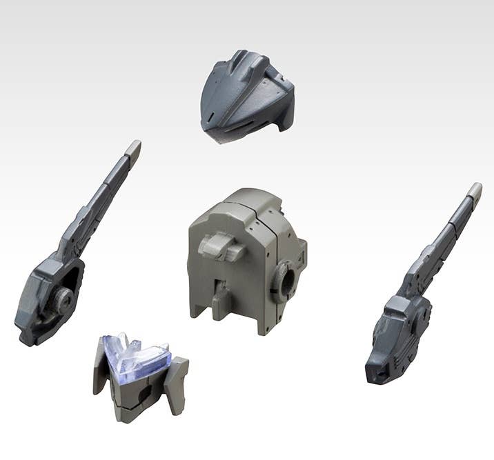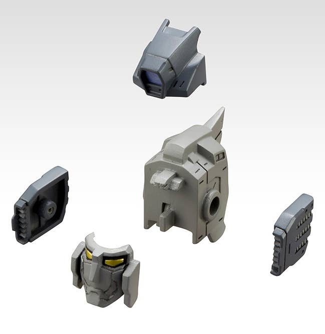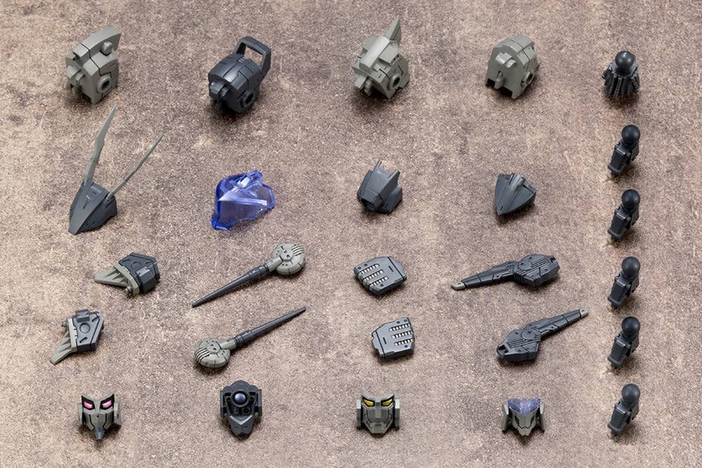 This kit includes parts for four separate heads and neck joints--parts for over 200 different combinations are included, for endless customization! Combine the main unit, face unit, side unit and visor unit to create your own custom mech! The heads are compatible with Frame Arms kits from Kotobukiya, and the neck joints have a 5mm ball joint, so they're also compatible with Hexa Gear figures. The parts are molded in light gray, dark gray and clear plastic.