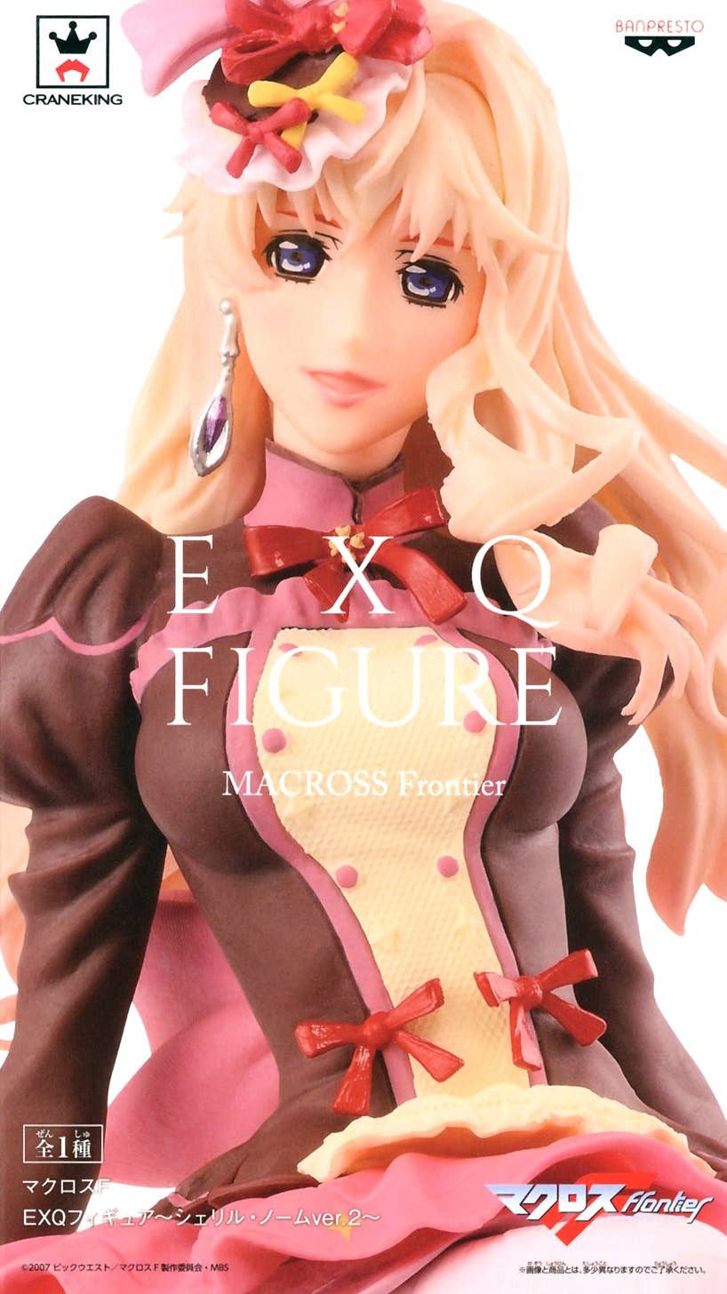 From "Macross Frontier" comes an EXQ figure of the Galactic Fairy, Sheryl Nome! She comes dressed in a shapely brown, pink and yellow top that shows off her figure, and a ruffly skirt with pink heels to match. She comes in a sitting pose with her arms resting behind her, so she can easily be display on the edge of a bookshelf or other edge. Order today!