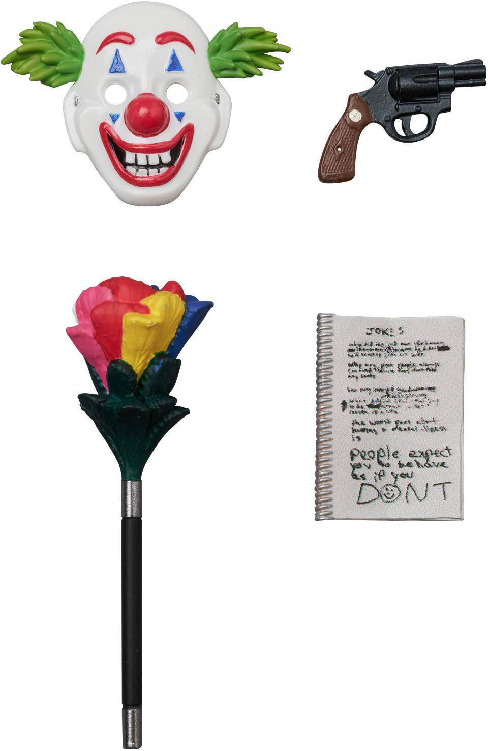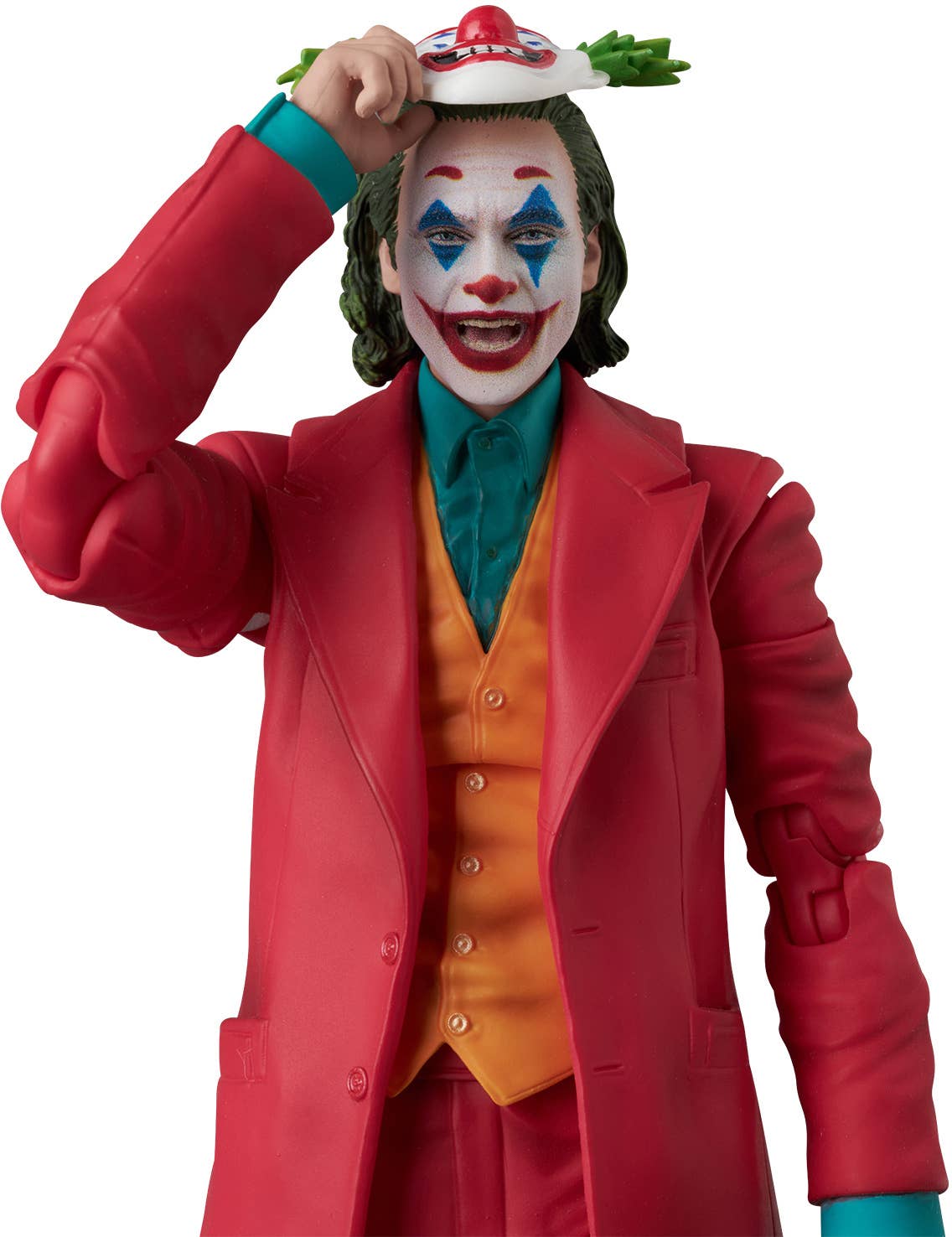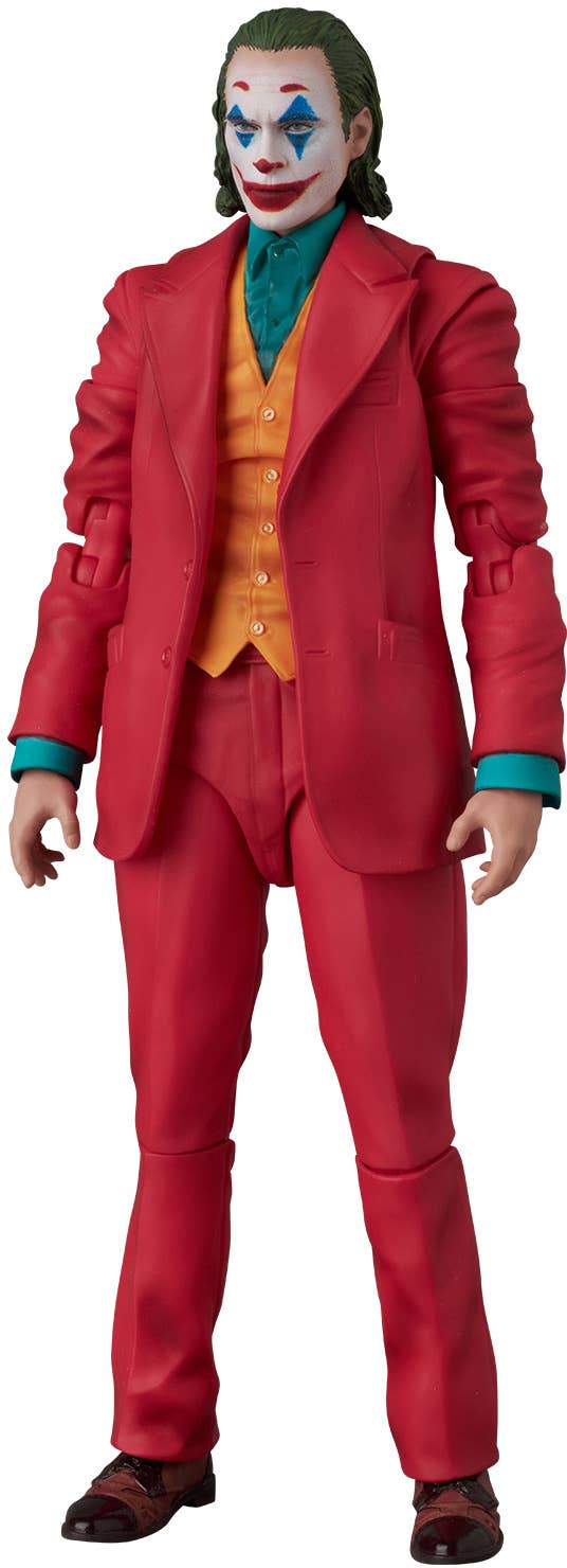 As seen in the 2019 film "Joker," the Joker himself joins the "MAFEX" action-figure series from Medicom! This deluxe figure set comes with five interchangeable heads, an alternate jacket, a seated lower-body part, and a flower bouquet, as well as a clown mask, a handgun, his joke notebook, a chair, and an articulated figure stand! The amazing staircase diorama display base is also included. Order the Joker for your own collection today!