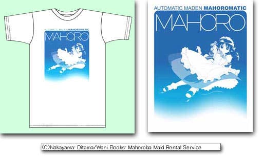 From Mahoromatic, this lovely white T-shirt is printed with a picture of Mahoro (maid version), flying, in a graded blue-to-white. 100% cotton; size L (please note when ordering that Japanese sizes are generally a half size to a full size smaller than North American sizes) only.