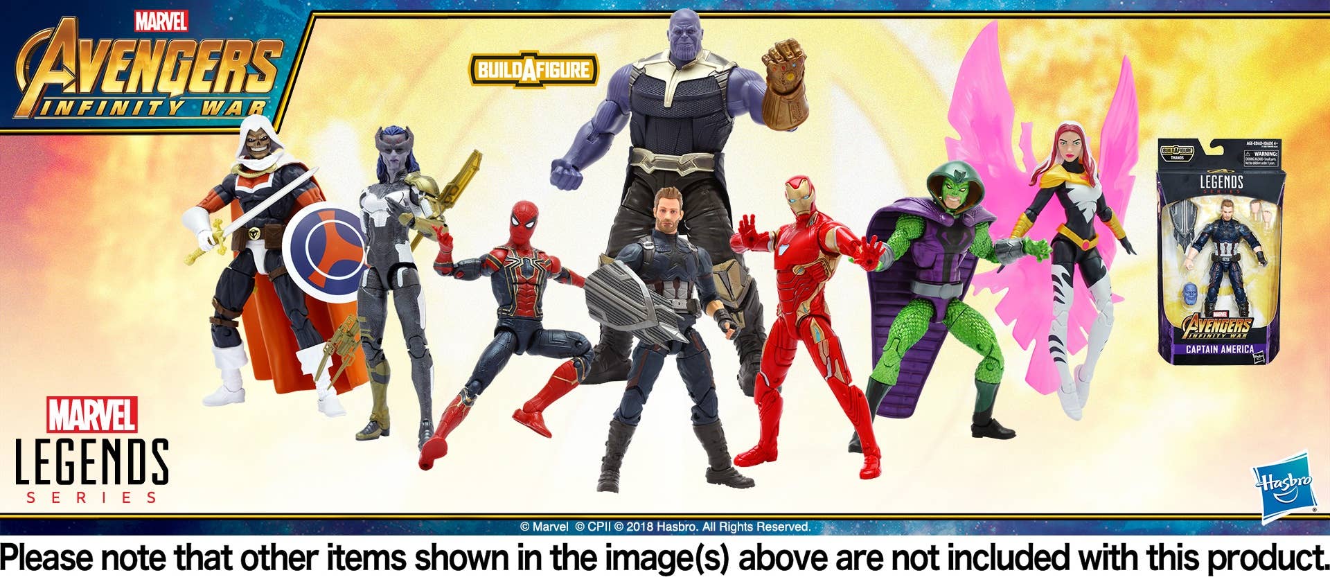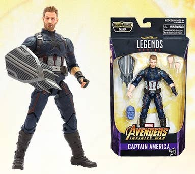 As seen in the Marvel Comics film "Avengers: Infinity War," the iconic Captain America now joins the Legends action figure series! He features 32 points of articulation for maximum heroic action, and he comes with his mighty shield, plus interchangeable hands. A portion of a Build-A-Figure of Thanos is also included -- collect the entire Avengers team to assemble the figure! Order yours now!