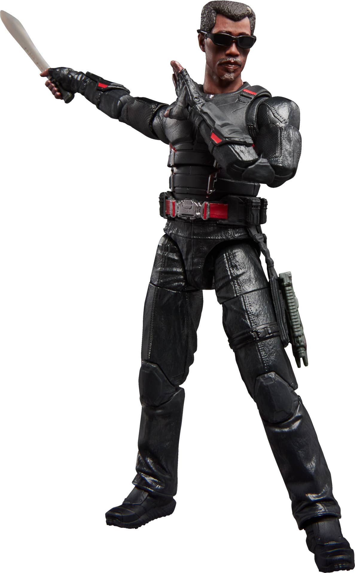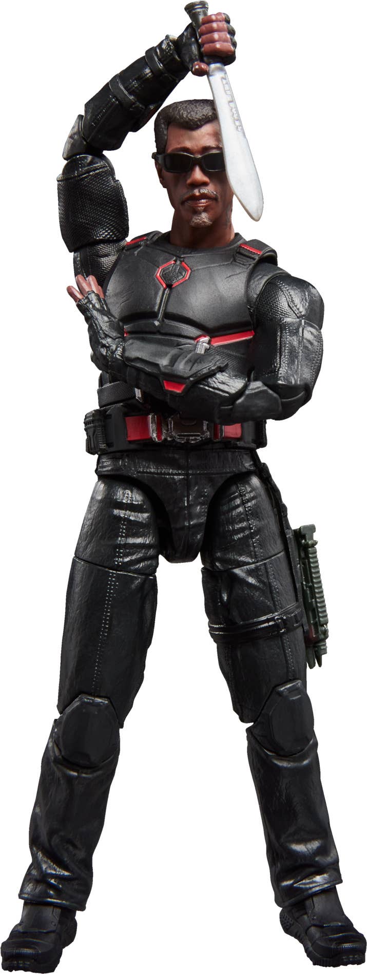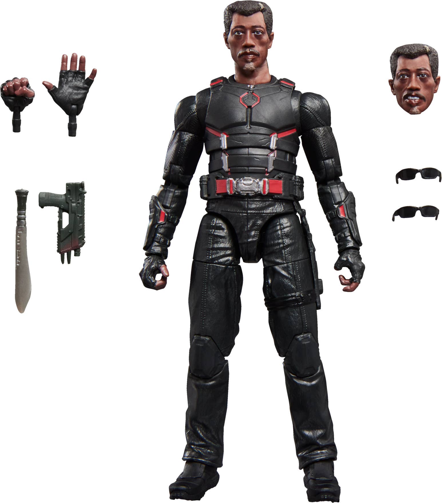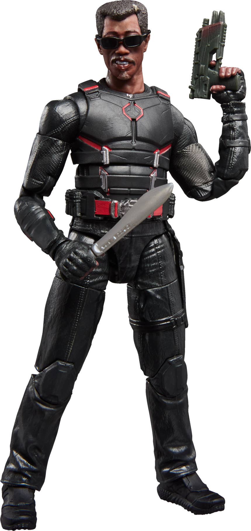 Blade from the 2024 film "Deadpool & Wolverine" joins the "Marvel Legends" action-figure series from Hasbro! The vampire hunter Blade is a formidable force as a founding member of the Resistance, thrown back into the fray after decades of isolation. His goal? To achieve a fitting end. This amazingly detailed action figure features more than 20 points of articulation for supreme posability -- he can even perform his trademark acrobatic kicks! He comes with two interchangeable heads, a pair of interchangeable hands, two pairs of sunglasses, his handgun, and his bladed weapon. Order him for your own collection today!