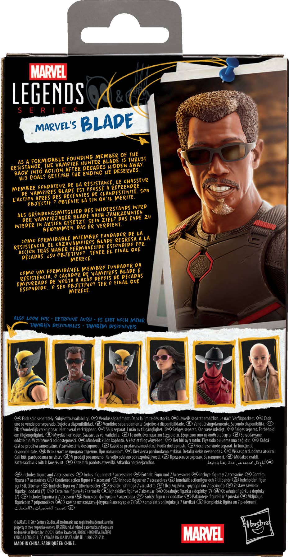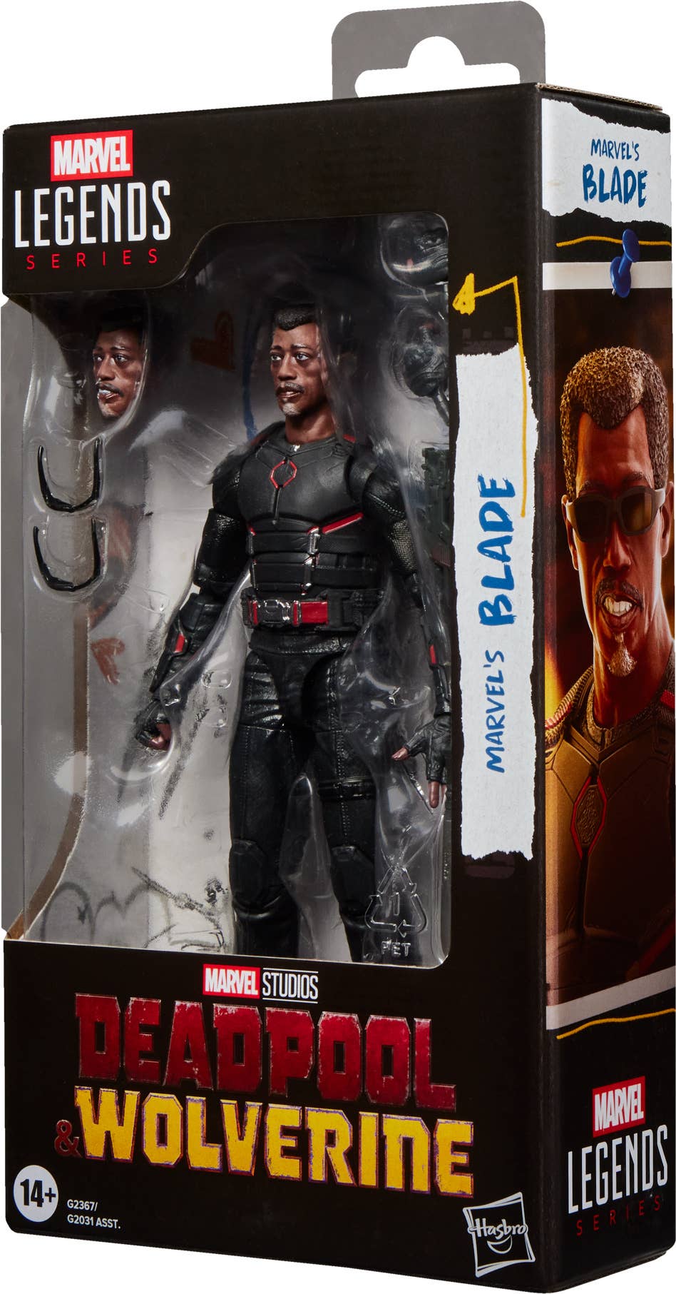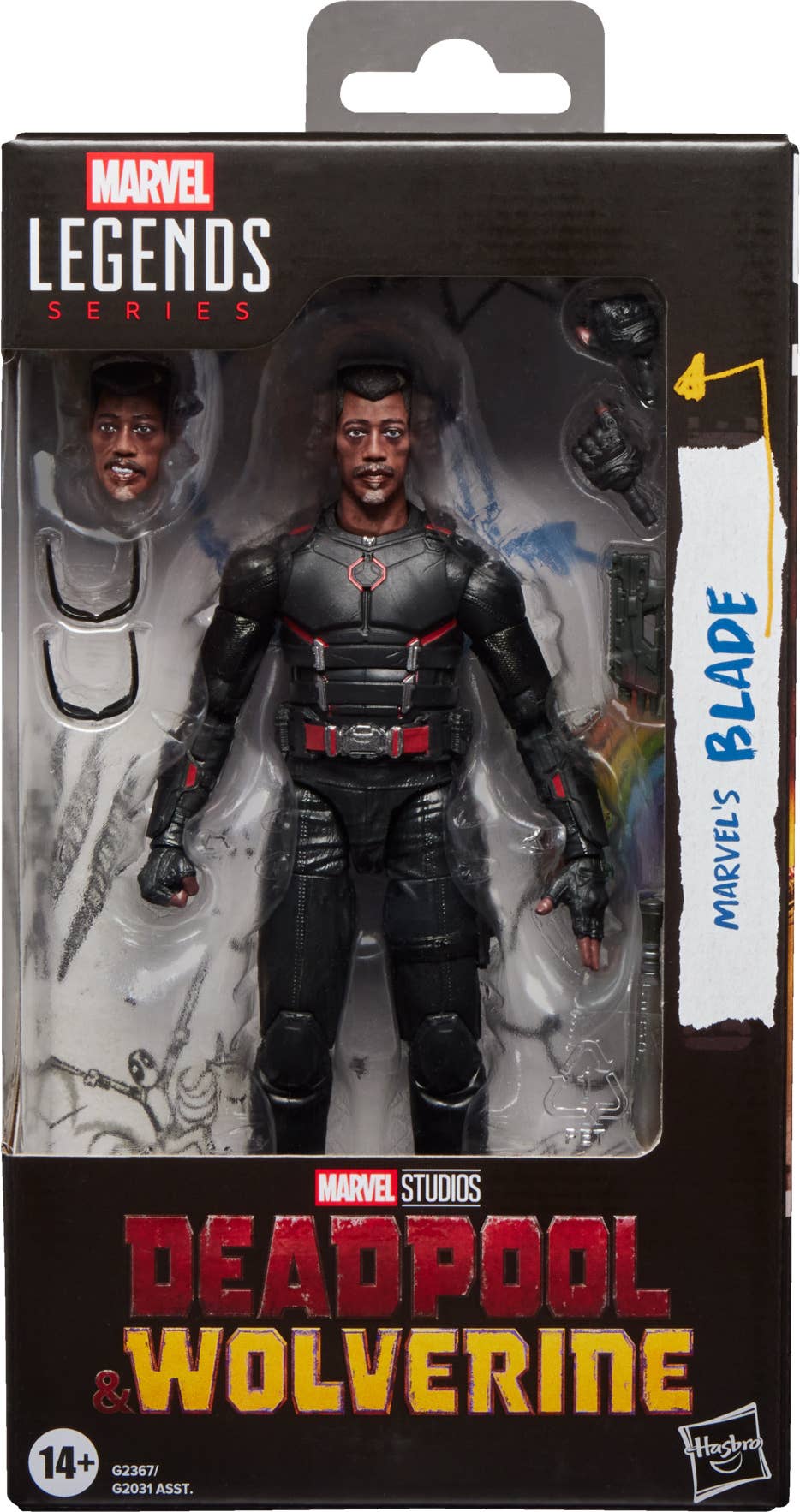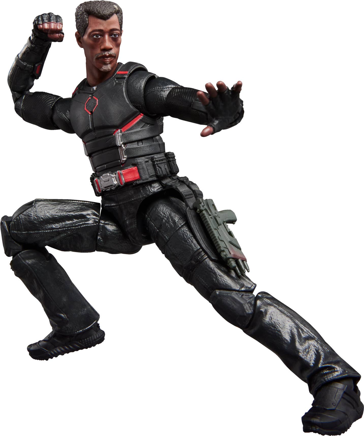 Blade from the 2024 film "Deadpool & Wolverine" joins the "Marvel Legends" action-figure series from Hasbro! The vampire hunter Blade is a formidable force as a founding member of the Resistance, thrown back into the fray after decades of isolation. His goal? To achieve a fitting end. This amazingly detailed action figure features more than 20 points of articulation for supreme posability -- he can even perform his trademark acrobatic kicks! He comes with two interchangeable heads, a pair of interchangeable hands, two pairs of sunglasses, his handgun, and his bladed weapon. Order him for your own collection today!
