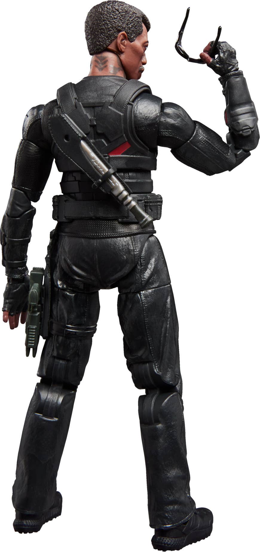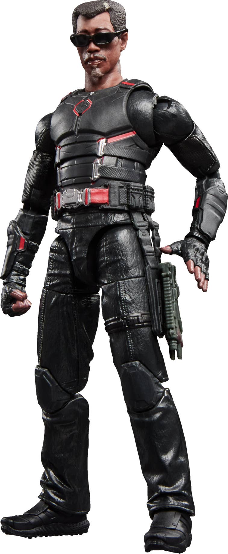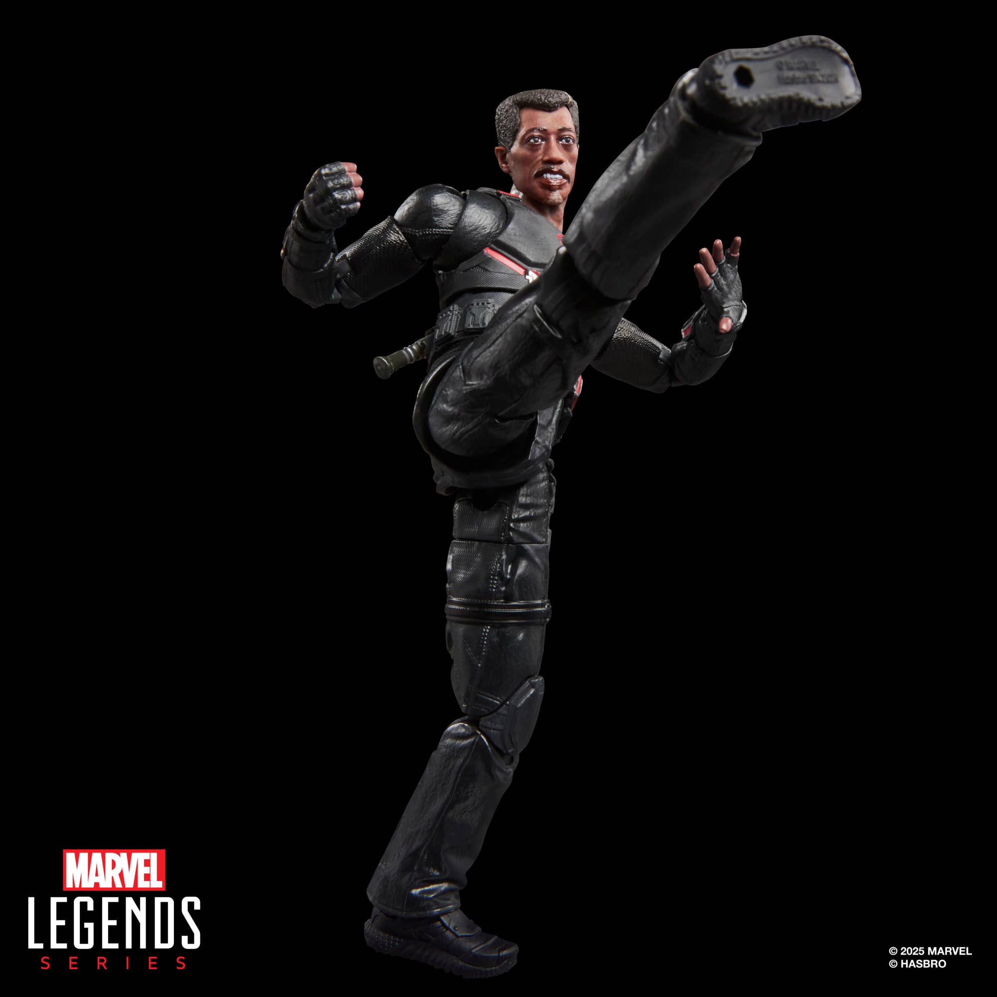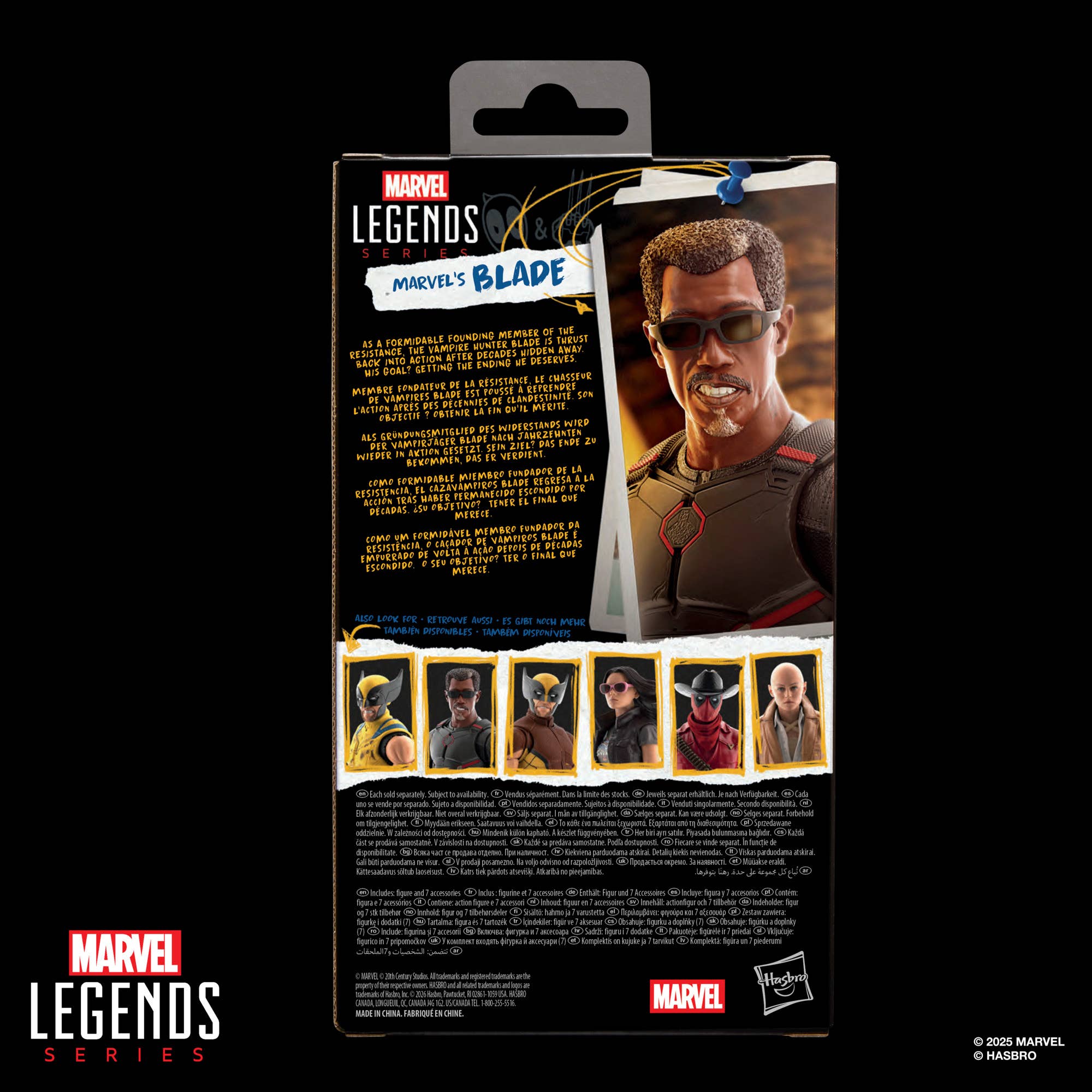 Blade from the 2024 film "Deadpool & Wolverine" joins the "Marvel Legends" action-figure series from Hasbro! The vampire hunter Blade is a formidable force as a founding member of the Resistance, thrown back into the fray after decades of isolation. His goal? To achieve a fitting end. This amazingly detailed action figure features more than 20 points of articulation for supreme posability -- he can even perform his trademark acrobatic kicks! He comes with two interchangeable heads, a pair of interchangeable hands, two pairs of sunglasses, his handgun, and his bladed weapon. Order him for your own collection today!