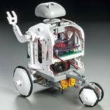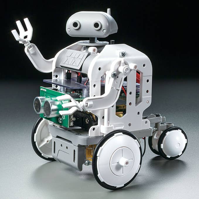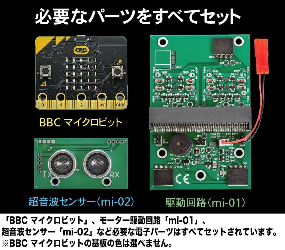 Use this kit to build a wheeled robot that runs on a BBC micro:bit microcomputer, ultrasonic sensor, and motor driver circuit. A pre-installed program allows the robot to issue orders to its motors avoid obstacles by using data passed on by the ultrasonic sensor. The head and arms move with the robot.