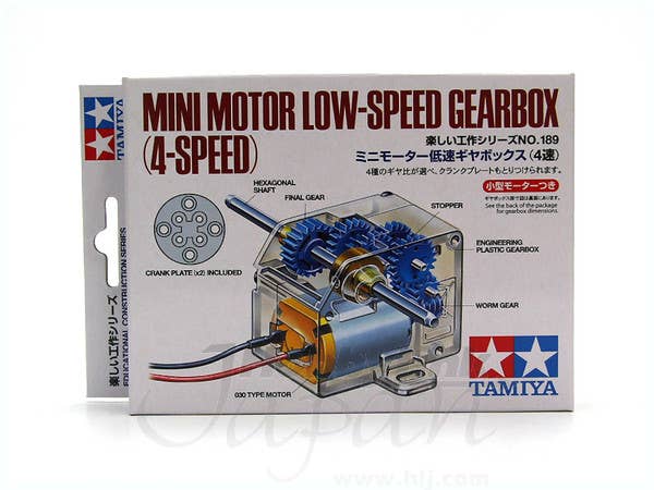 Electric motor and low-speed gearbox set. Gearbox features four speeds. Includes an 030 type motor and two crank plates. Great for scratch-building or science-fair type projects.