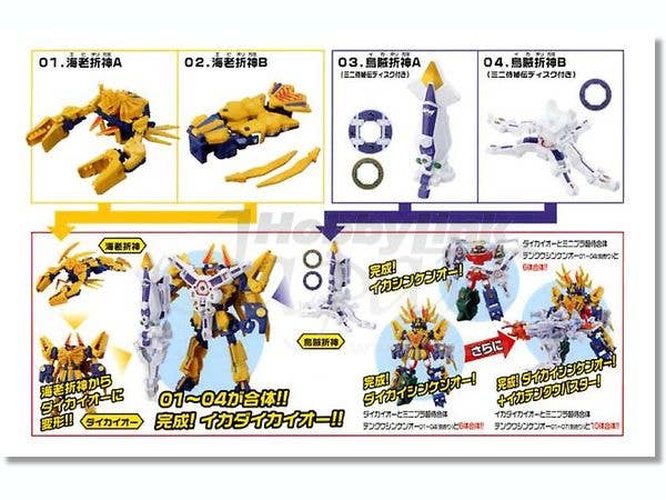 Shinkenger's first eight Origami are offered as these simple mini plastic kits that fans can easily build and transform the Origami into Shinken-Oh and Daitenkuu, and have them both combine to form the great Chou Samurai Gattai Tenkuu Shinken-Oh! This lineup consists of Shishi Origami,Ryuu Origami, Kuma Origami, Kame Origami & Saru Origami, Kabuto Origami, Kajiki Origami, and Tora Origami. The first five Origami can switch between their animal and emblem modes, and can combine together into Shinken-Oh, while the latter three can combine together to form Daitenkuu. Parts come molded in color and stickers are provided for detail. Sold by the arranged box of 12 consisting of three of Shishi Origami, two apiece of Ryuu Origami, Kuma Origami, Kame Origami & Saru Origami, and one apiece of Kabuto Origami, Kajiki Origami, and Tora Origami. This means that you get to build the combined Chou Samurai Gattai Tenkuu Shinken-Oh as well as one regular Shinken-Oh, and one extra Shishi Origami! Not only that, you can also combine the Origami from Mini Pla Samurai Gattai Ika DaiKai-Oh (sold separately) to form the ultimate Daikai Shinken-Oh with IkaTenku Buster!