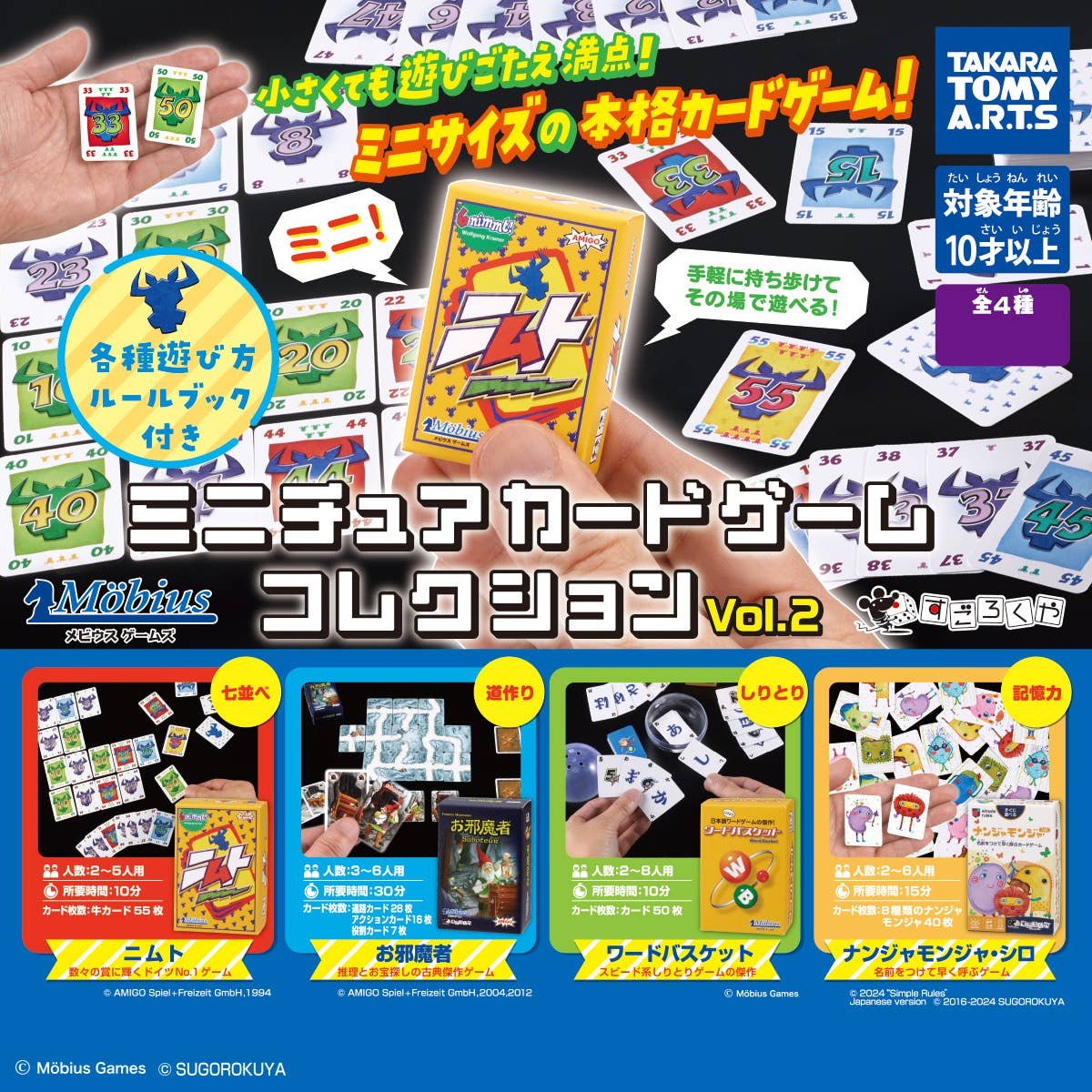 The second installment of a popular gacha series miniaturizes board games that everyone can enjoy. In this release, it includes Germany's No.1 card game "Nimmt", the classic masterpiece game of deduction and treasure hunting "Intruder", the renowned speed-themed word chain game "Word Basket", and the uproarious Russian-born card game "Nanja Monja White". The dimensions of the main body are approximately: Box: H5.5 x W4 x D1.9 - 2.4cm, Cards: H4.8 x W2.6cm (common for all types).