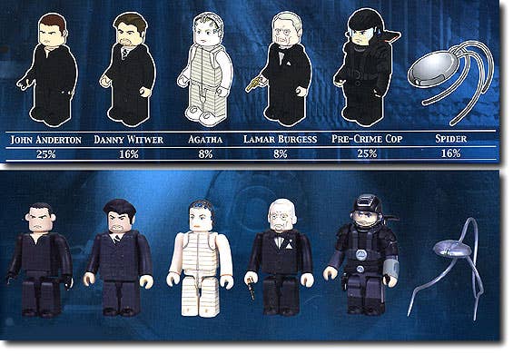 Ever wanted to know what Tom Cruise would look like as a Kubrick figure? Now you can find out!! This terrific little series from the film 'Minority Report' includes the following figures: John Anderton, Danny Witwer, Agatha, Lamar Burgess, a generic Pre-Crime officer, and a generic 'spider'. Please note that these are trading figures and are individually sealed and randomly packed in boxes of 24 before shipment to HobbyLink Japan. As a result we are unable to honour requests for individual or specific figures, nor can we promise you which figure(s) you will receive in a box. Please order only if you are willing to run with any of the possible types. Everyone runs.