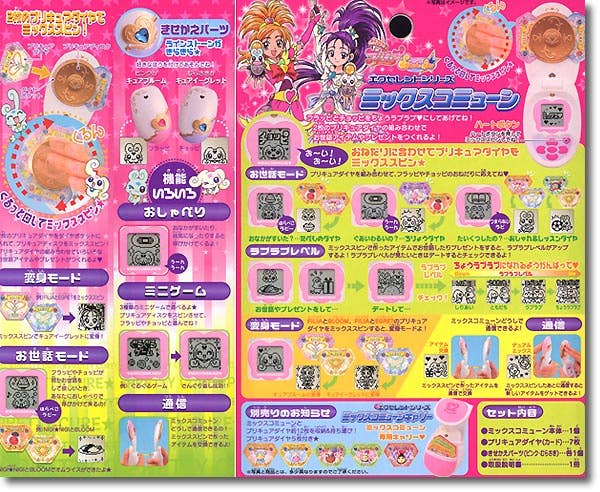 The "Mix Commune" comes with seven Pretty Cure Dials (cards), one purple and one pink attachment parts (to allow you to play as either Egret or Bloom), and instructions (in Japanese). Use it in "transform", "heal/care", "chat", "mini-game" and "communication" modes! Requires 2 AAA batteries, not included.