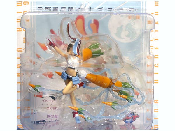 Here's Meena, full blast! Based on Okama's illustration, smiling Meena is set in a beautiful dynamic pose, launching carrot missiles with multi-colored streams of smoke from the big carrot boosters attached to her back. Please note that figures such as this are mass produced and as a result some inconsistencies in finish and painting may occur; these are not considered manufacturer's defects. If you absolutely must have perfection, prepare to do some touch-up work on your own.