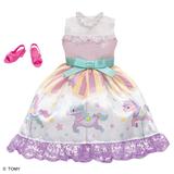 This dress features a cute ribbon at the waist and a pink merry-go-round pattern on the skirt. It comes with pink shoes.