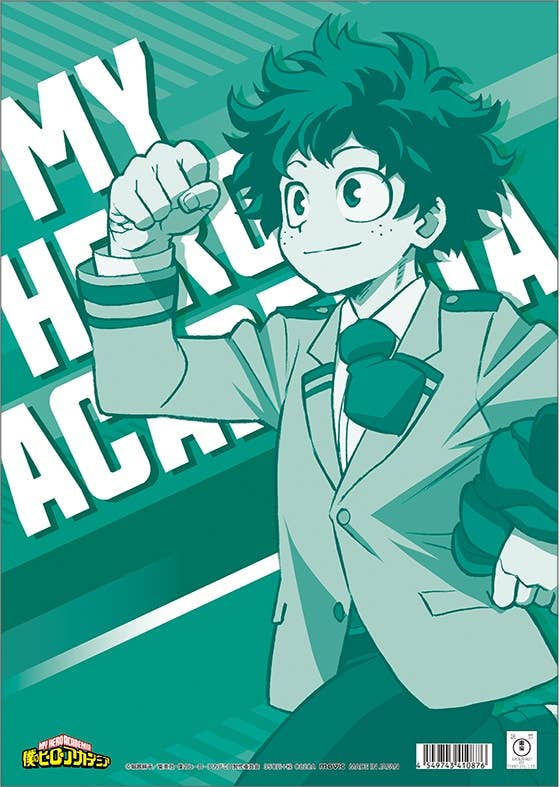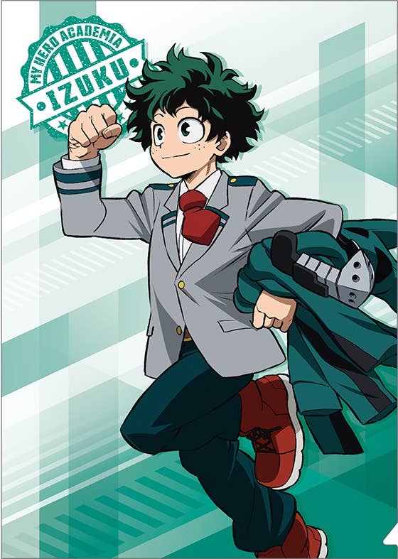 A clear file featuring newly drawn, full color artwork of "My Hero Academia" character Izuku Midoriya dashing off with his hero costume in hand. Order yours today!