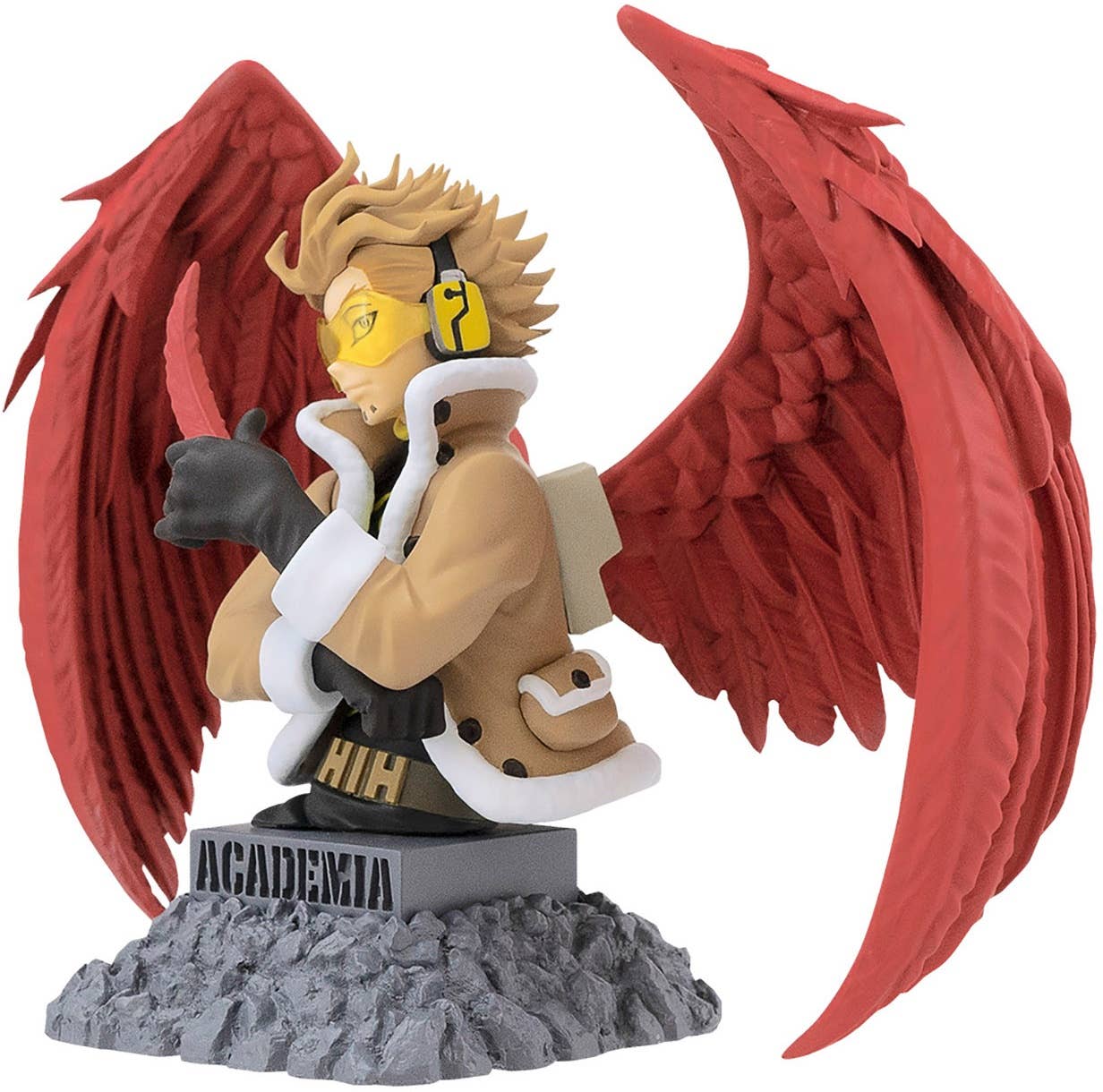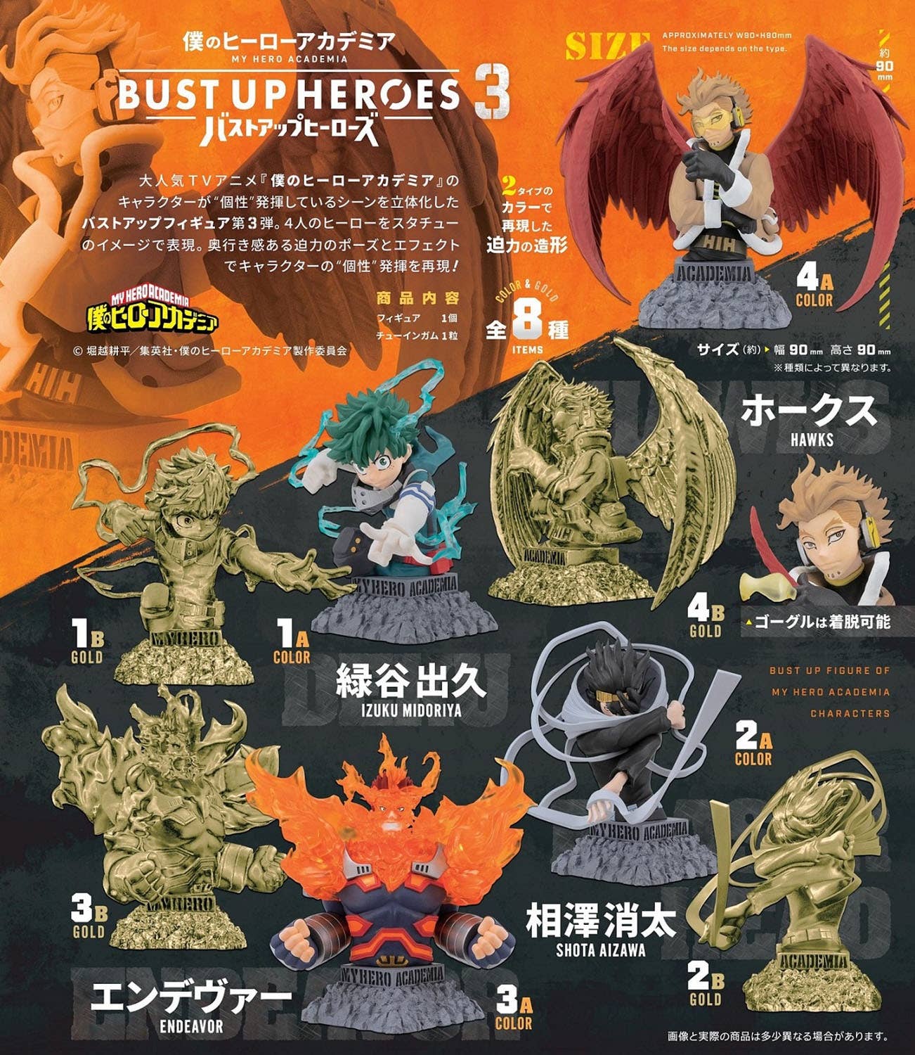 These highly detailed bust figures of your favorite characters from "My Hero Academia" are incredibly detailed! There are four different characters, and each comes in both a full-color version, and a gold-colored version for an extra impressive appearance! The full-color version of Hawks can be displayed with or without his goggles. Each figure comes with a piece of gum, and you'll get one of each in the box. Order yours now!