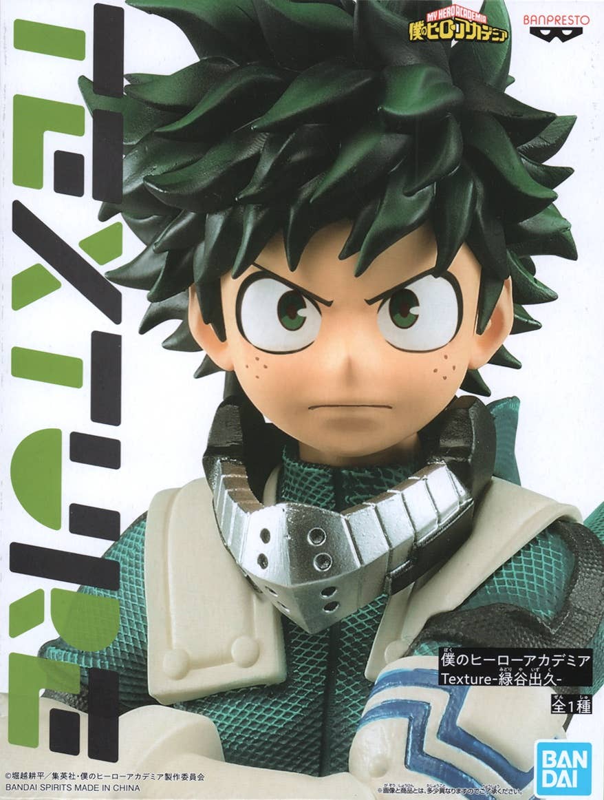 Banpresto's newest figure of Izuku Midoriya from "My Hero Academia" concentrates on the different textures of his outfit! The woven appearance of the fabric of his suit, the hard chrome-finished surface of his mouthpiece, and the glossy surfaces of his gloves are all carefully sculpted and painted for a realistic look. Add him to your collection today!