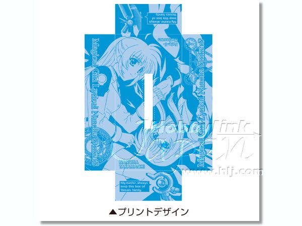 A beautiful illustration of Nanoha and Fate, printed in shades of blue, is featured on this tissue box cover that will fit perfectly on a slim-type tissue box. Made of a fabric-like material, it measures 11.5cm wide by 24.5cm long by 5.5cm tall.