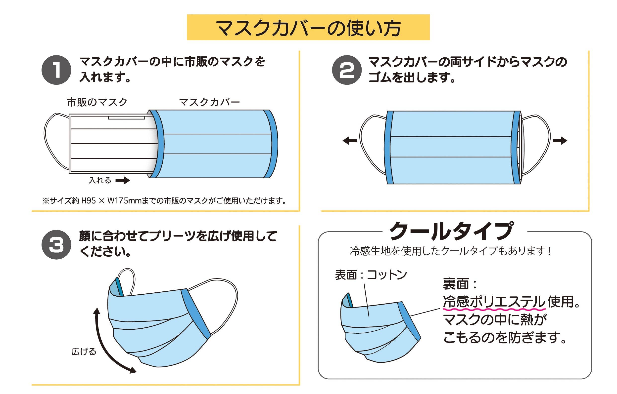 To use, simply slide your normal mask inside so that the earloops are accessible from either side. The cover is made from cotton with a cool polyester on the inside to keep heat from building up on the inside.