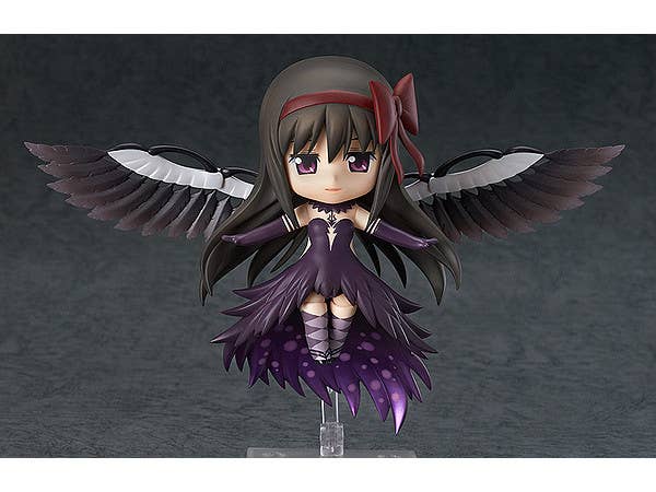 From "Puella Magi Madoka Magica The Movie -Rebellion-" comes the long-awaited Nendoroid of Devil Homura! Her stunning jet-black dress and devil wings have all been carefully shrunk down into Nendoroid size. She comes with her standard expression as well as a smiling expression. Optional parts include the dark orb as well as a special hand part holding Kyubey. Enjoy recreating all of your favorite scenes from the movie!