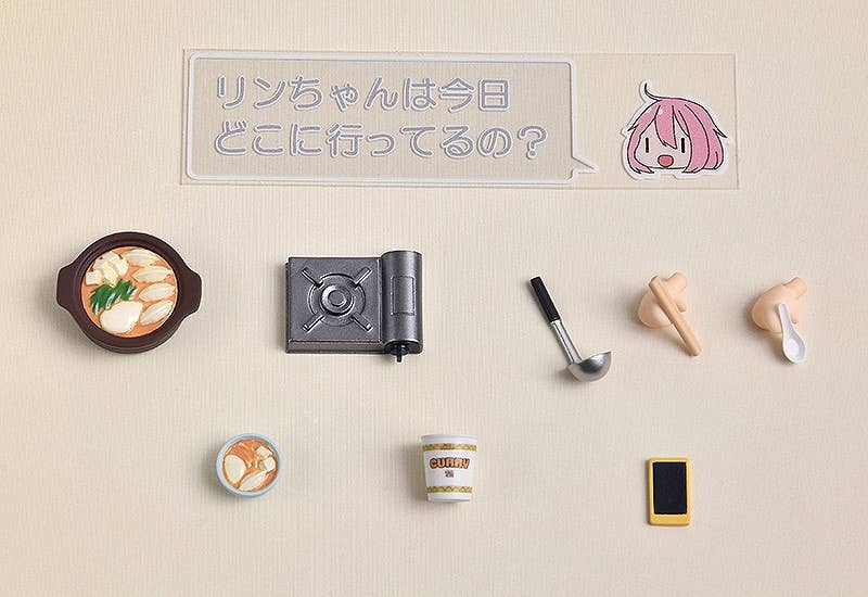 Optional parts include the curry noodles she received from Rin Shima in episode one, a gyoza hot pot, gas stove, bowl, chopsticks, soup spoon and ladle! In addition, the Nendoroid also comes with a social media text plate to recreate the iconic timelines from the series, as well as a paper picnic sheet to display with her! Enjoy a laid-back camp right by your side in Nendoroid size!