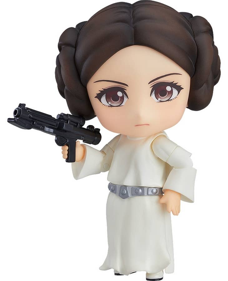 From "Star Wars Episode 4: A New Hope" comes a Nendoroid of Princess Leia! Her iconic white outfit from the film has been captured with great care as a single part on the Nendoroid, and she features articulated arms allowing for various different poses. Two different weapons are also included for even more possible situations!