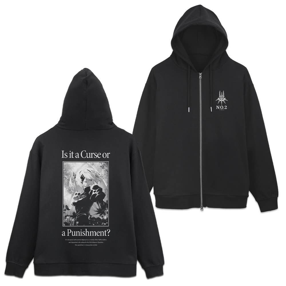 This zippered hooded sweatshirt jacket from Cospa featuring 2B from "NieR:Automata Ver1.1A" will quickly become your favorite! Its smooth texture and soft feel is thanks to its 100 percent cotton fabric, knitted at a high density using fine yarns for an elegant sheen. The fleece lining gives you excellent moisture absorption and management, making it comfortable to wear even for long periods of time. It has a relaxed silhouette, with extra room in the body and sleeves that allows layering; the in-seam pockets give the jacket a clean look. The double zipper can be adjusted to suit your preference, and the double-layered hood is oversized for ample coverage. The hood strings even have metal tips to prevent fraying and ensure long-lasting wear! You'll love it -- order yours today!