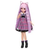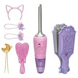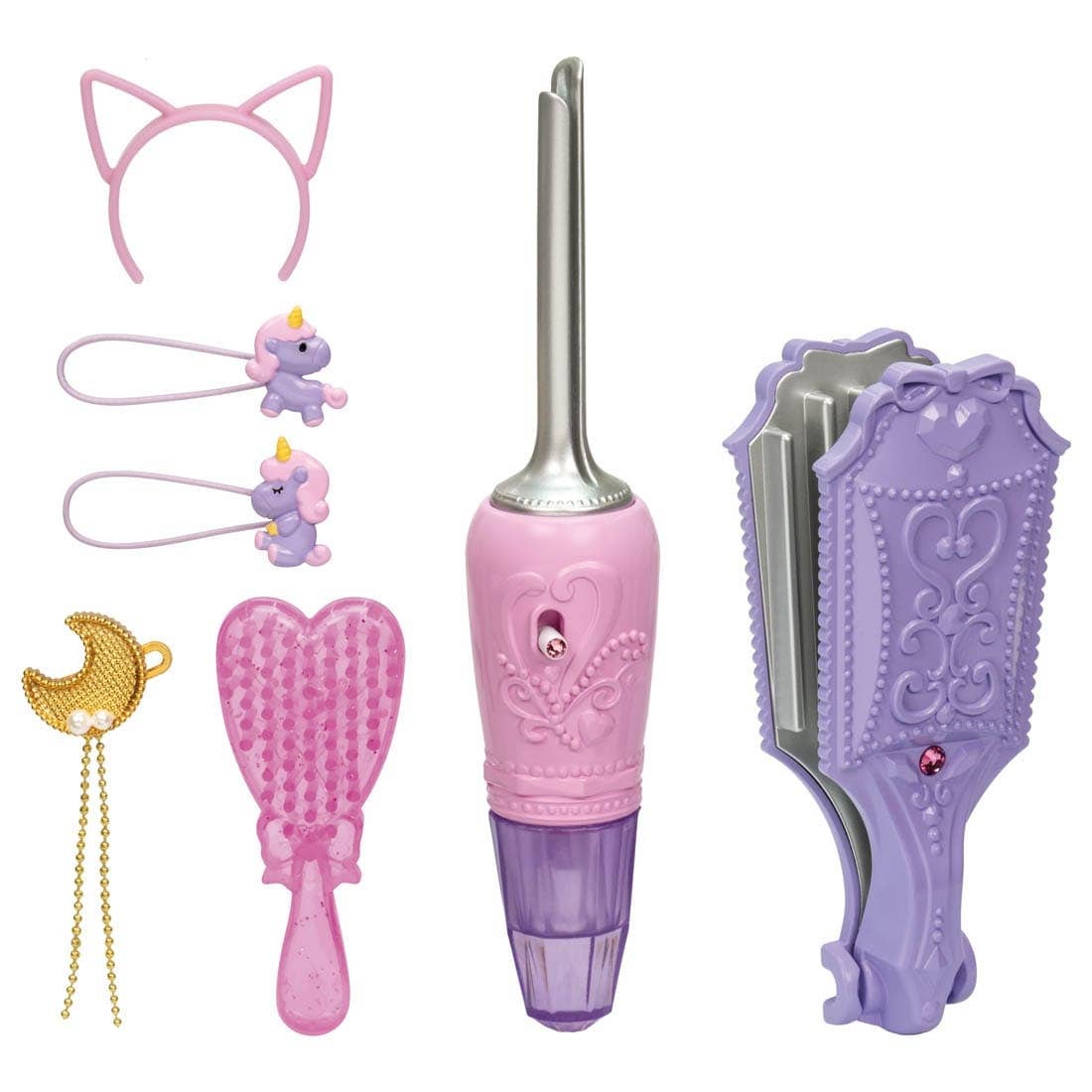 Doll (wearing dress, underwear, catsuit, earrings) (1), spin curler (1), waffle curler (1), moon barrette (1), unicorn pony (2), cat ears catsuit (1), heart brush (1), socks (1), shoes (1), stand (1), arrangement BOOK(1)