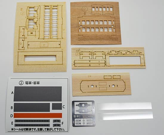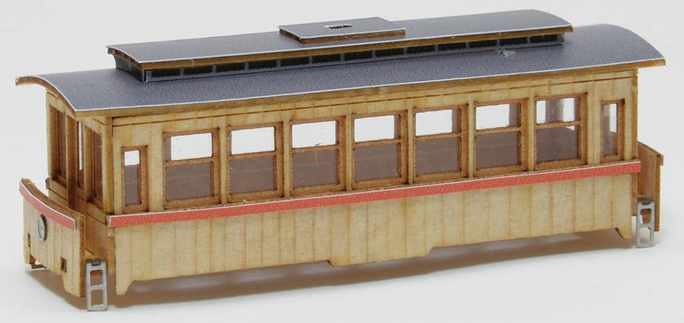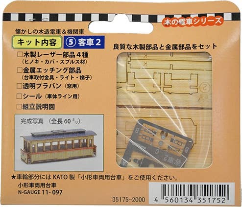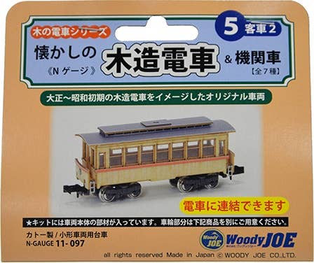 This kit builds a Woody Joe original train car imagined from the Taisho and early Showa eras of Japan. This series features seven cars in all: three electric cars, three passenger cars, and one engine. Each kit set includes laser-cut wooden parts, metal parts, and sheet.