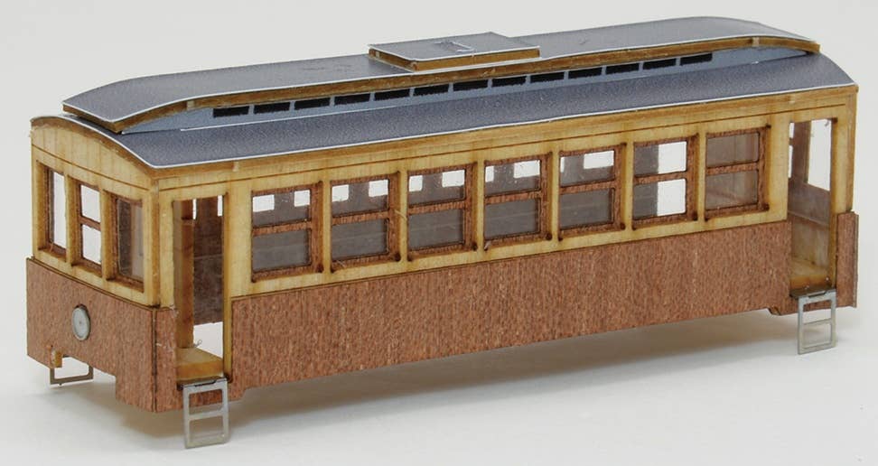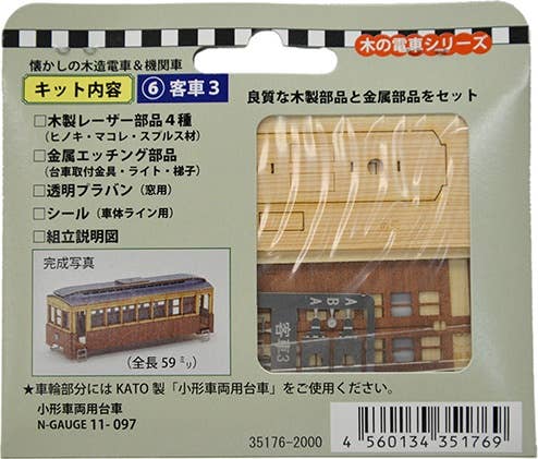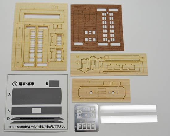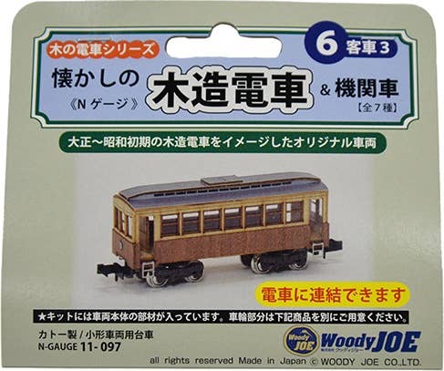 This kit builds a Woody Joe original train car imagined from the Taisho and early Showa eras of Japan. This series features seven cars in all: three electric cars, three passenger cars, and one engine. Each kit set includes laser-cut wooden parts, metal parts, and sheet.