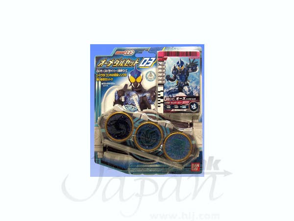 This special set gathers three Core Medals -- Shachi (orca), Unagi (eel) and Tako (octopus) -- and one Gambaride card. For use in all Kamen Rider OOO products that employ the medals.